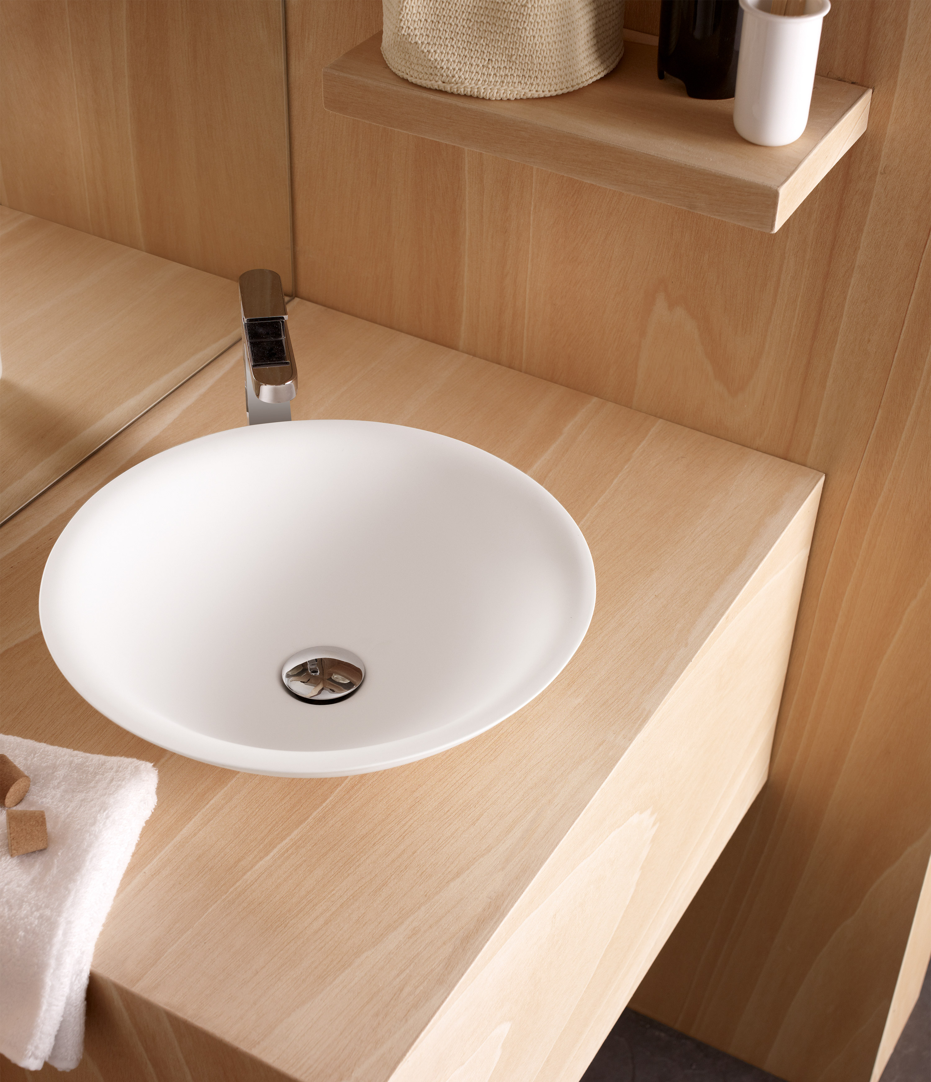 Lavabo circular de solid surface en blanco, con una superficie lisa y continua que refuerza la pureza de su diseño. Una pieza ligera y versátil para proyectos contemporáneos.