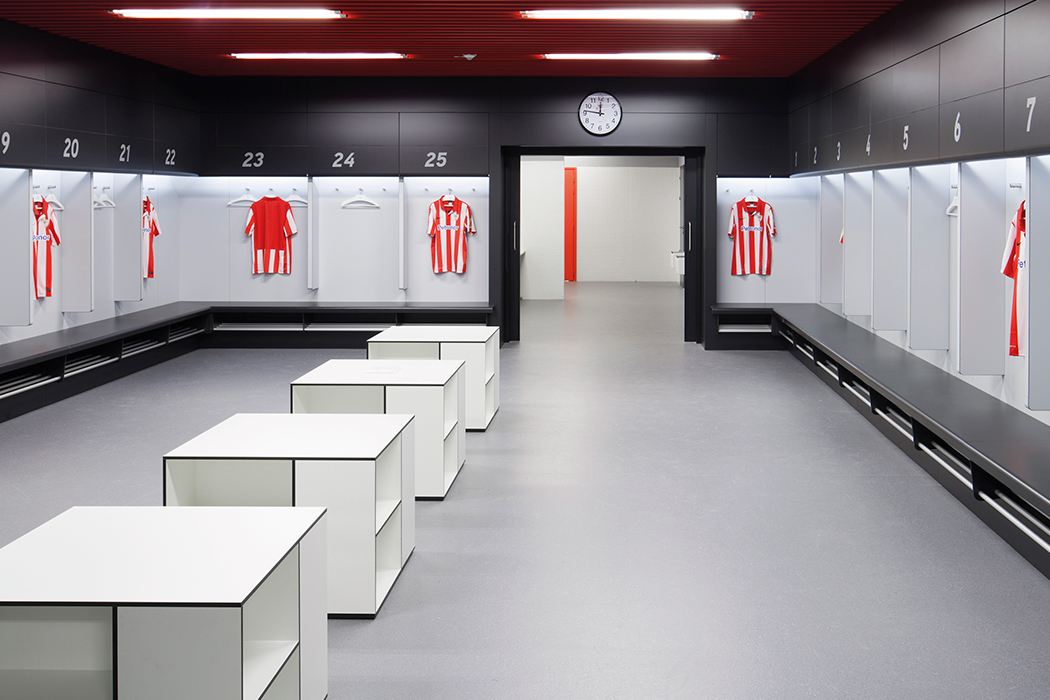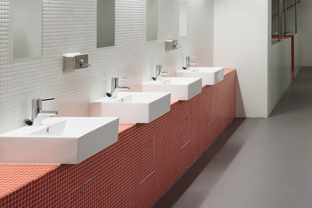 En los baños del estadio, fueron instalados en hilera lavabos Bolonia de Bathco perteneciente a la colección de porcelana rectangular, simulando junto a la pared roja, el escudo del equipo.
