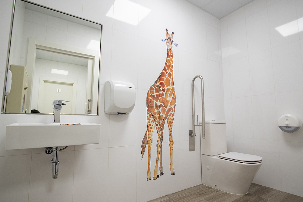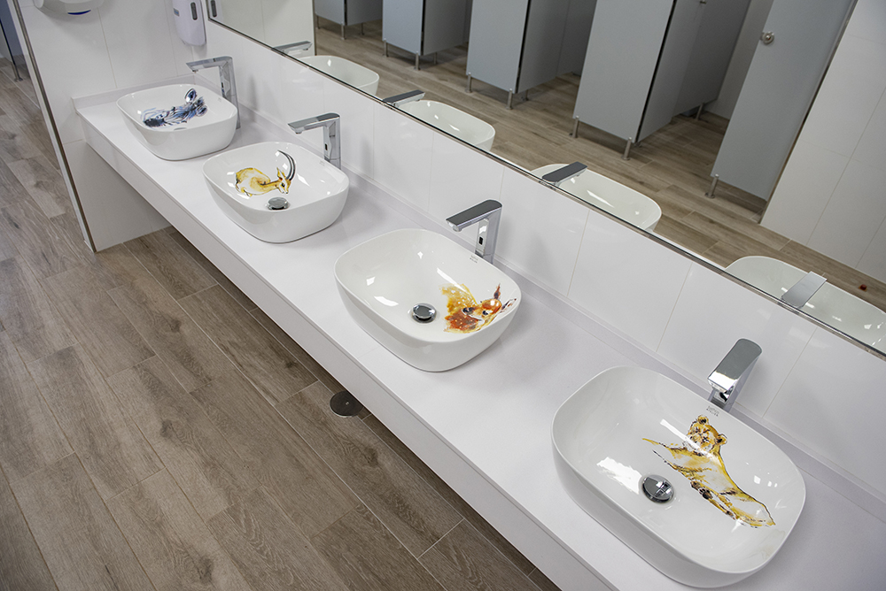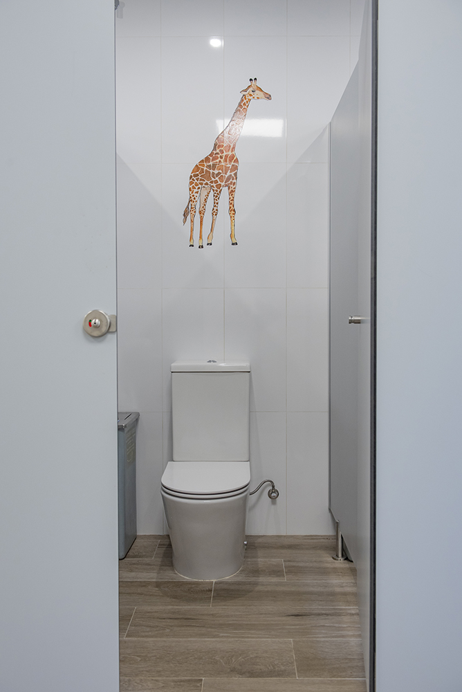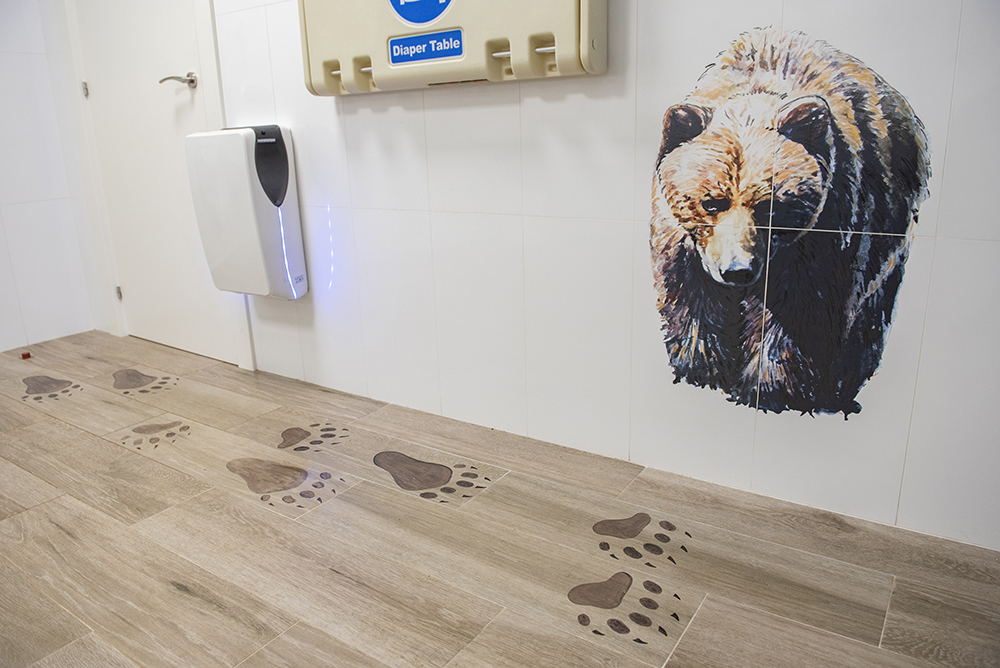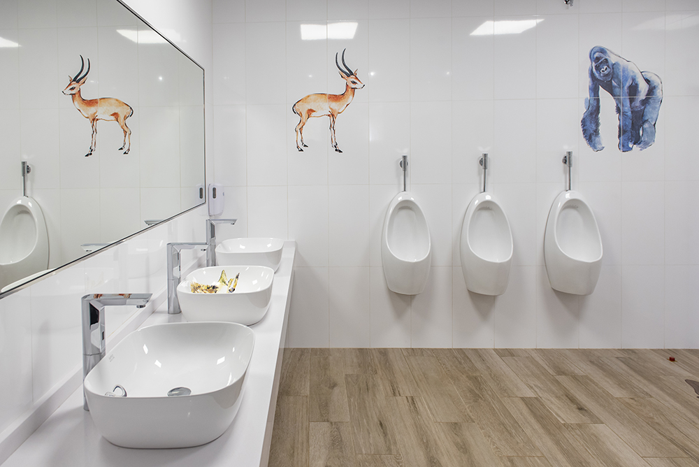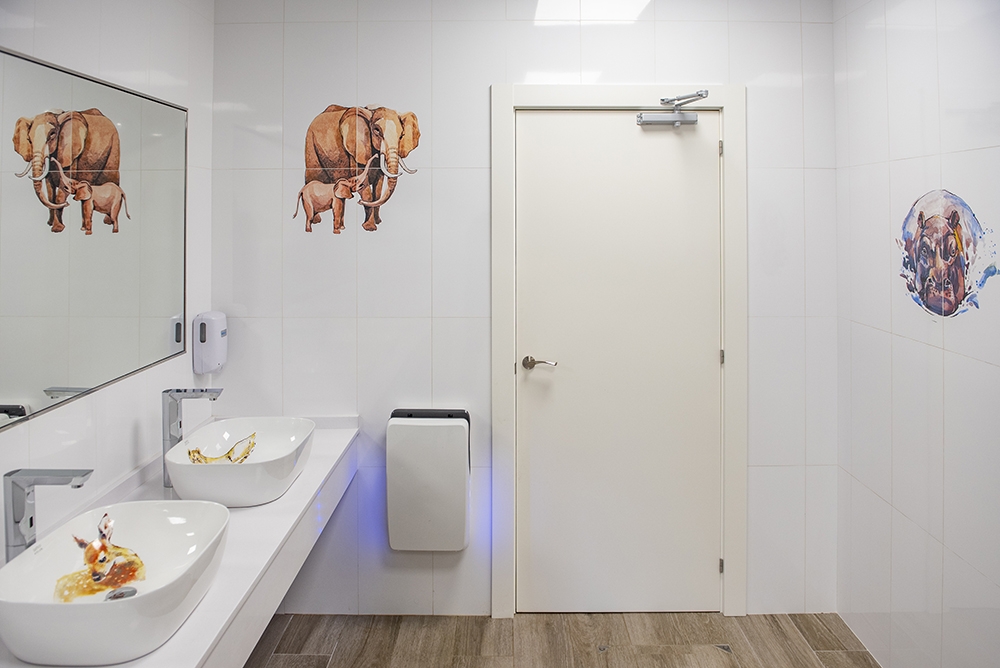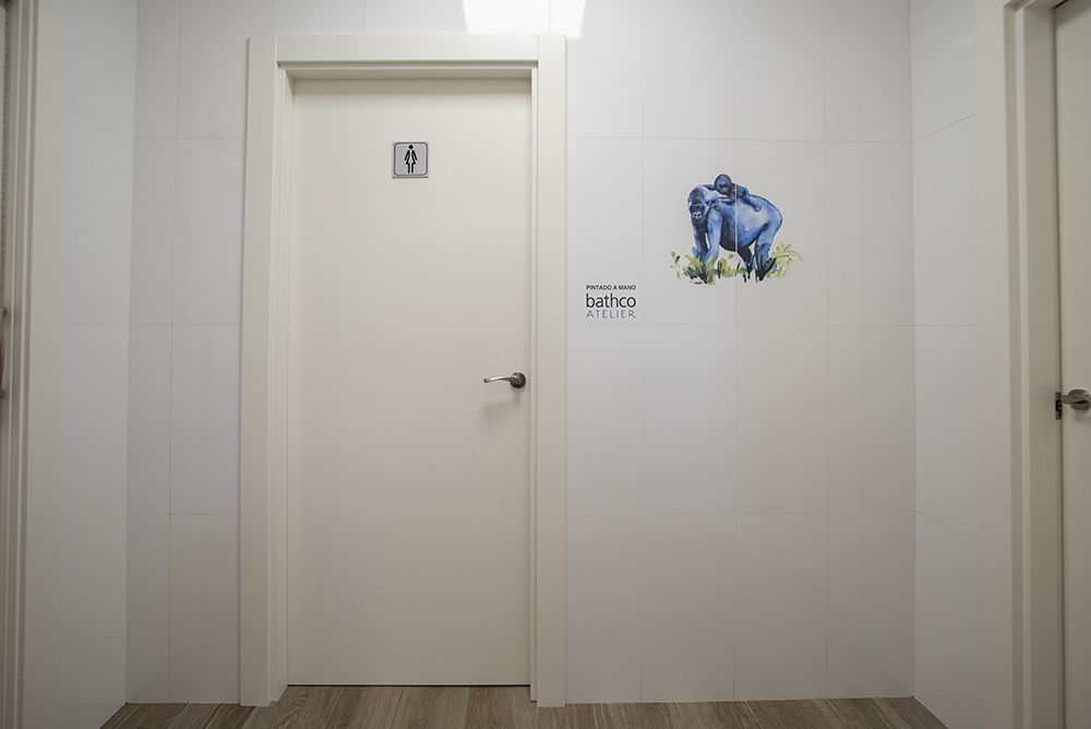 La intervención artística comienza con las huellas pintadas sobre algunas de las baldosas que revisten el suelo, conduciéndonos hasta todos los lavabos sobre encimera y los azulejos de las paredes. “Allá donde dirijamos la mirada encontraremos representados leones, bisontes, antílopes, jirafas o gorilas entre otros muchos animales que nos observan, haciéndonos sentir en un espacio único y sobre todo vivo” afirman los artistas que desarrollaron el trabajo.