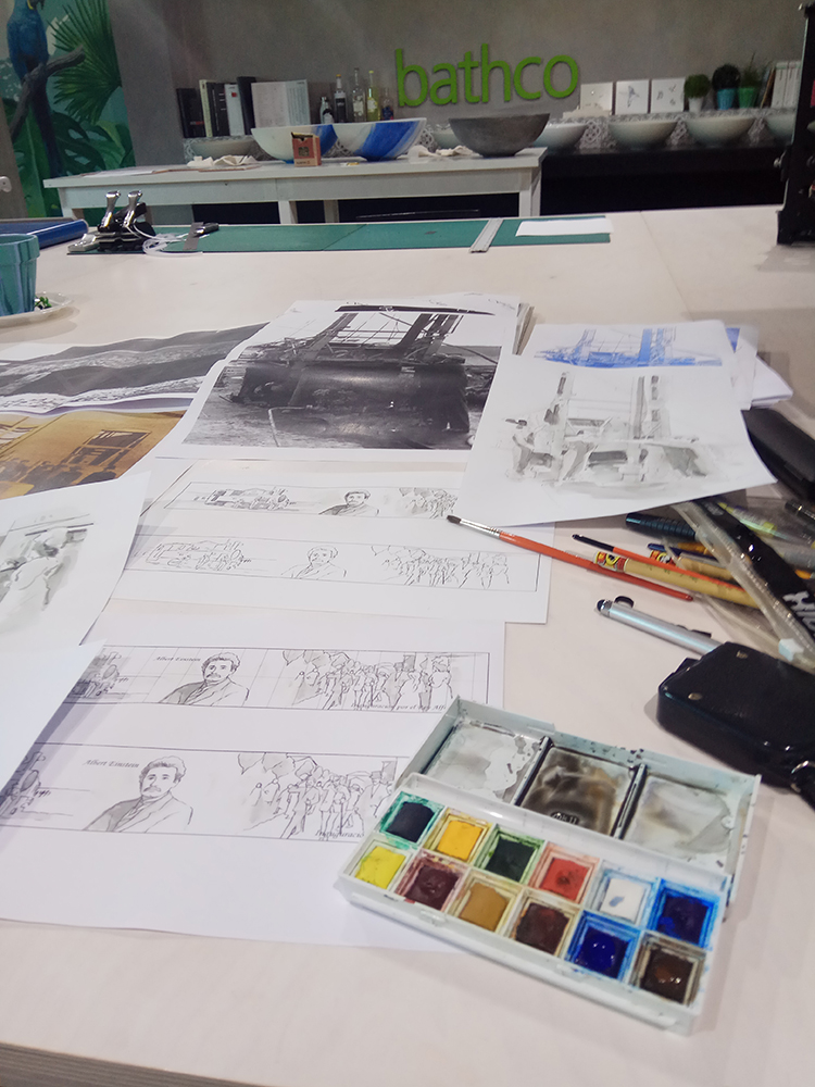 María Centeno y Cecilio Espejo han sido los artistas del Atelier encargados de rediseñar y plasmar las imágenes de la historia del edificio en sus paredes y en la zona de los aseos. Para realizar este trabajo se trabajaron digitalmente las imágenes y se convirtieron en calcas cerámicas que posteriormente se aplicaron en los azulejos de las paredes, en los inodoros y lavabos. En definitiva, se logró convertir el nuevo centro formativo en una pequeña exposición fotográfica integrada totalmente en el edificio. Así cada elemento mantiene viva la historia de este espacio que durante muchos años sirvió de escuela para los hijos de los empleados de la fábrica de Solvay.
