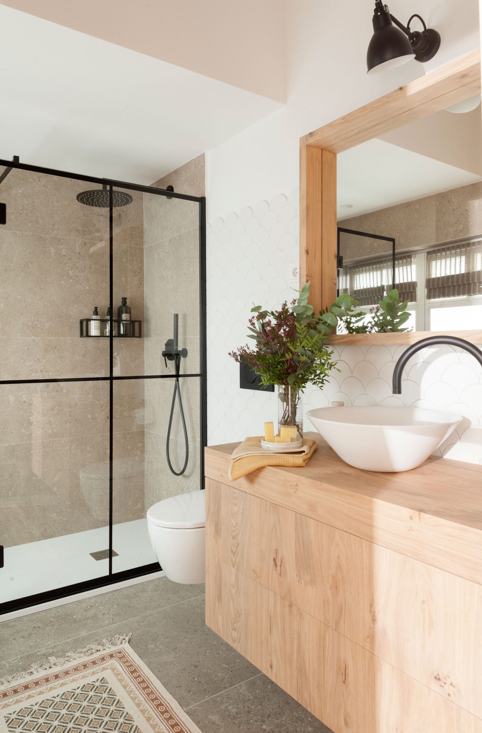 Gracias a un espacio desaprovechado en la entrada se pudo incorporar un aseo y un armario, todo el conjunto integrado en un frontal de paneles de madera que consolida el espacio. En el aseo se colocó un lavabo Polaris de Solid Surface de Bathco.