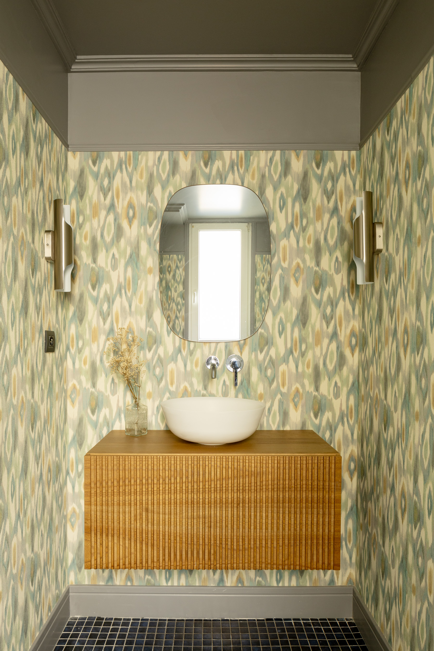 En una pared forrada de madera junto a la zona de sofás se encuentra una puerta que da acceso a un baño donde se puede encontrar el lavabo Livorno sobre mueble suspendido. La zona del aseo se sitúa junto a la ventana para aprovechar la luz al máximo.