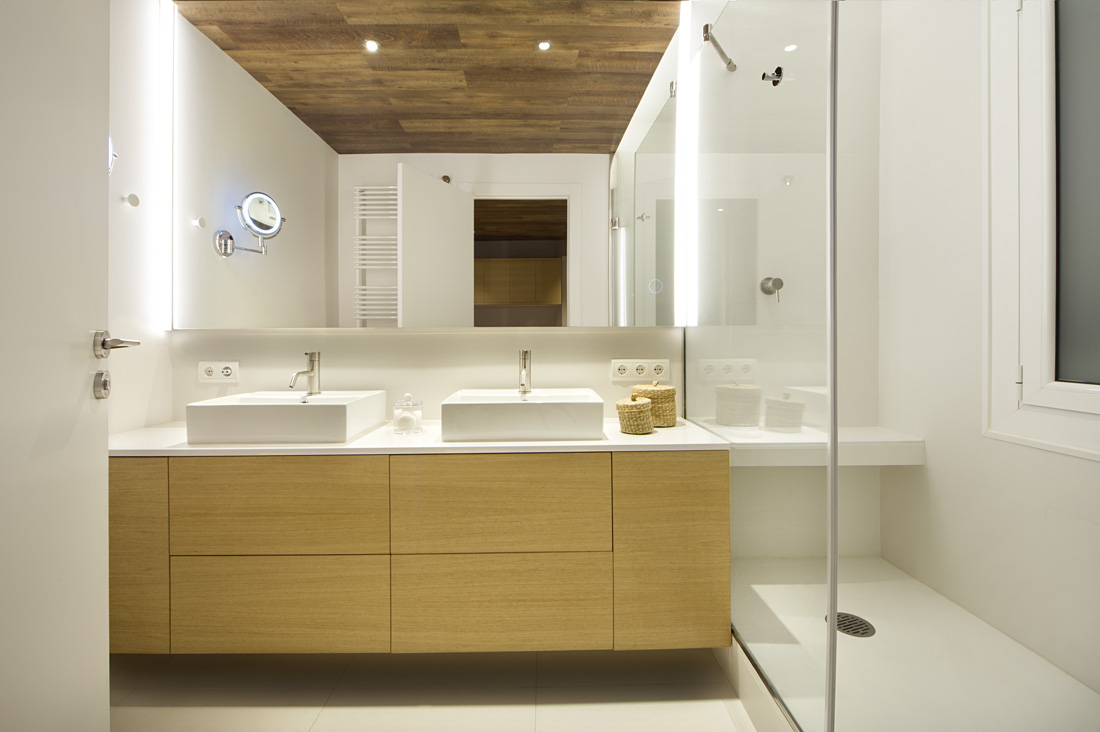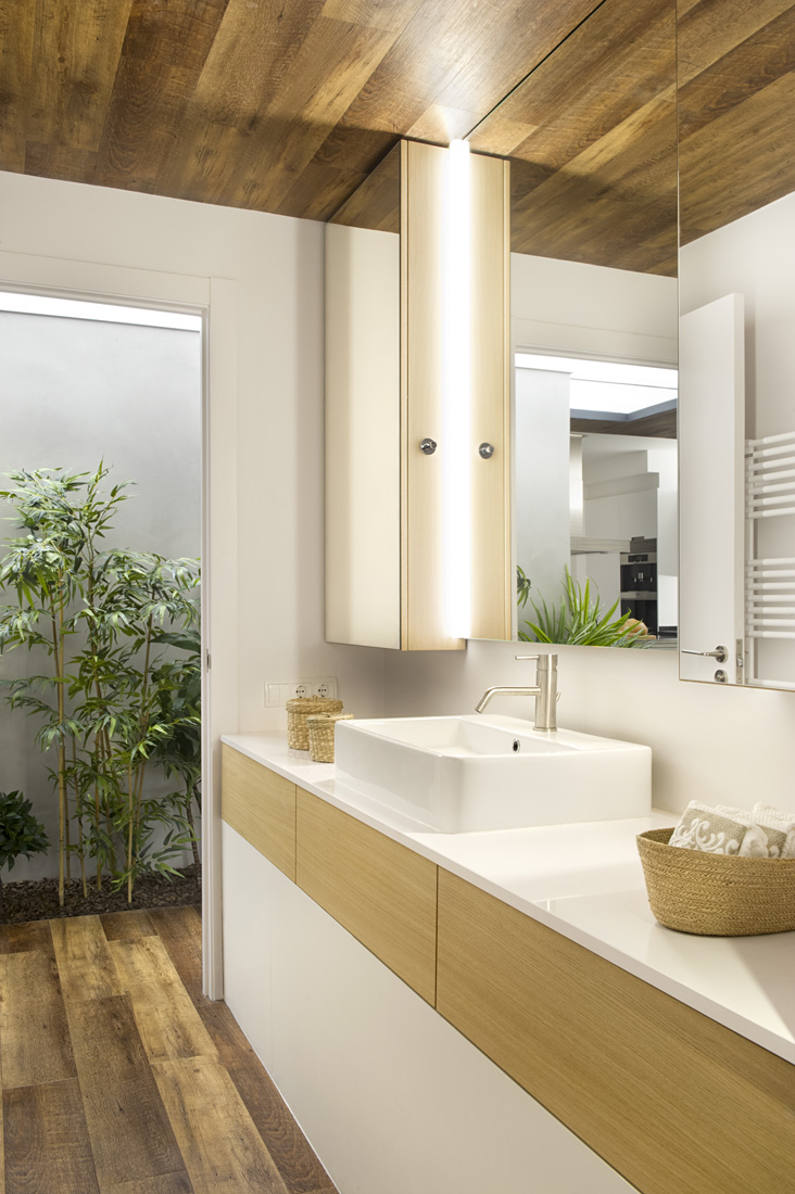 This flat in Barcelona’s Eixample neighbourhood can accommodate up to ten people thanks to its layout. On its more private side, we find three bedrooms with dressing rooms and private baths featuring Bathco’s Santander washbasin. Access to the private section is through a foyer and hall that combines elegance and practicality, neutrality and personality, interior and exterior, and metallic gleams with the freshness of plants.