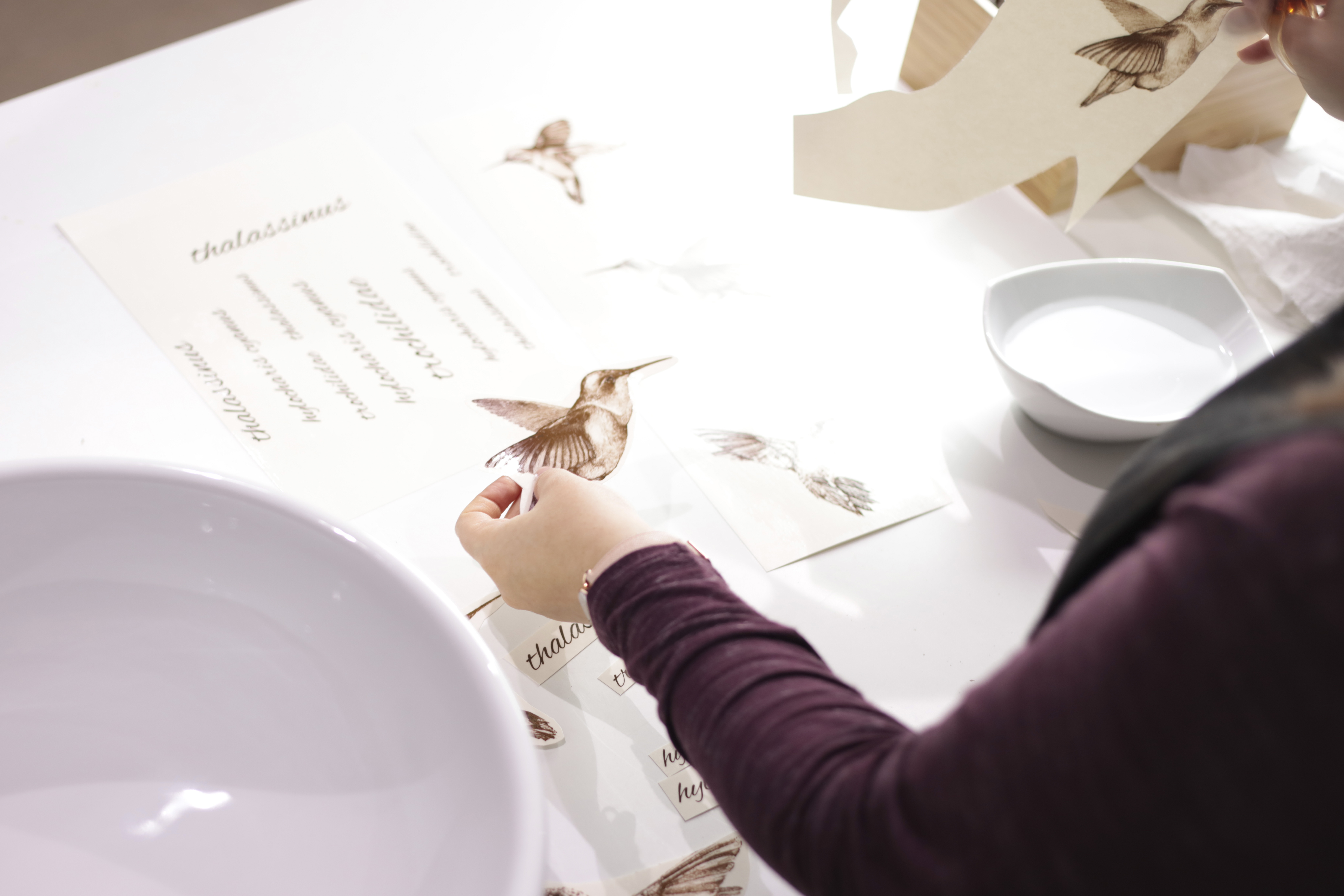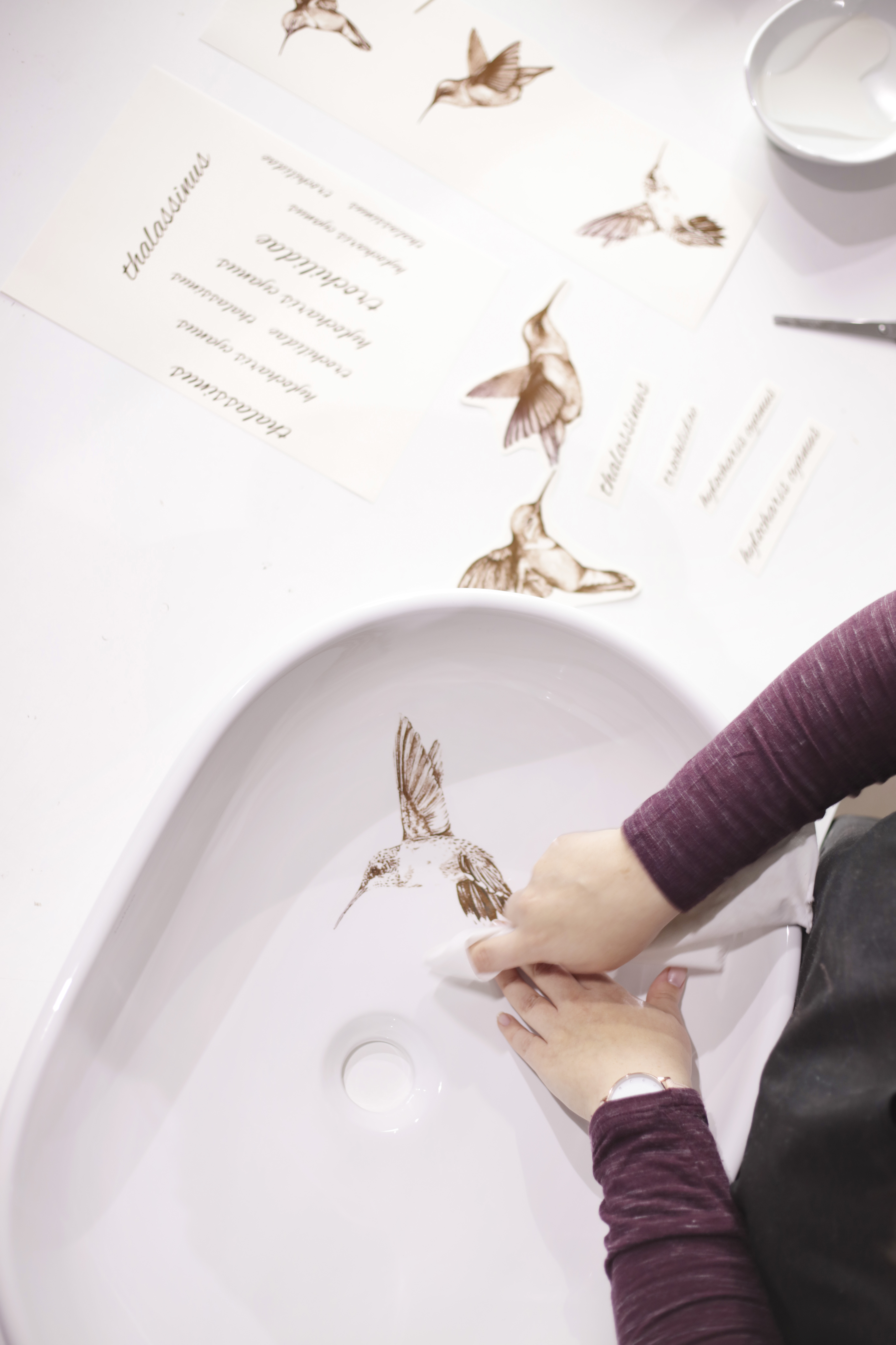 In this project, the artists of the Atelier went one step further. They decorated a porcelain washbasin with ceramic decals representing a hummingbird in different positions, with the names of the different varieties of this bird interspersed.