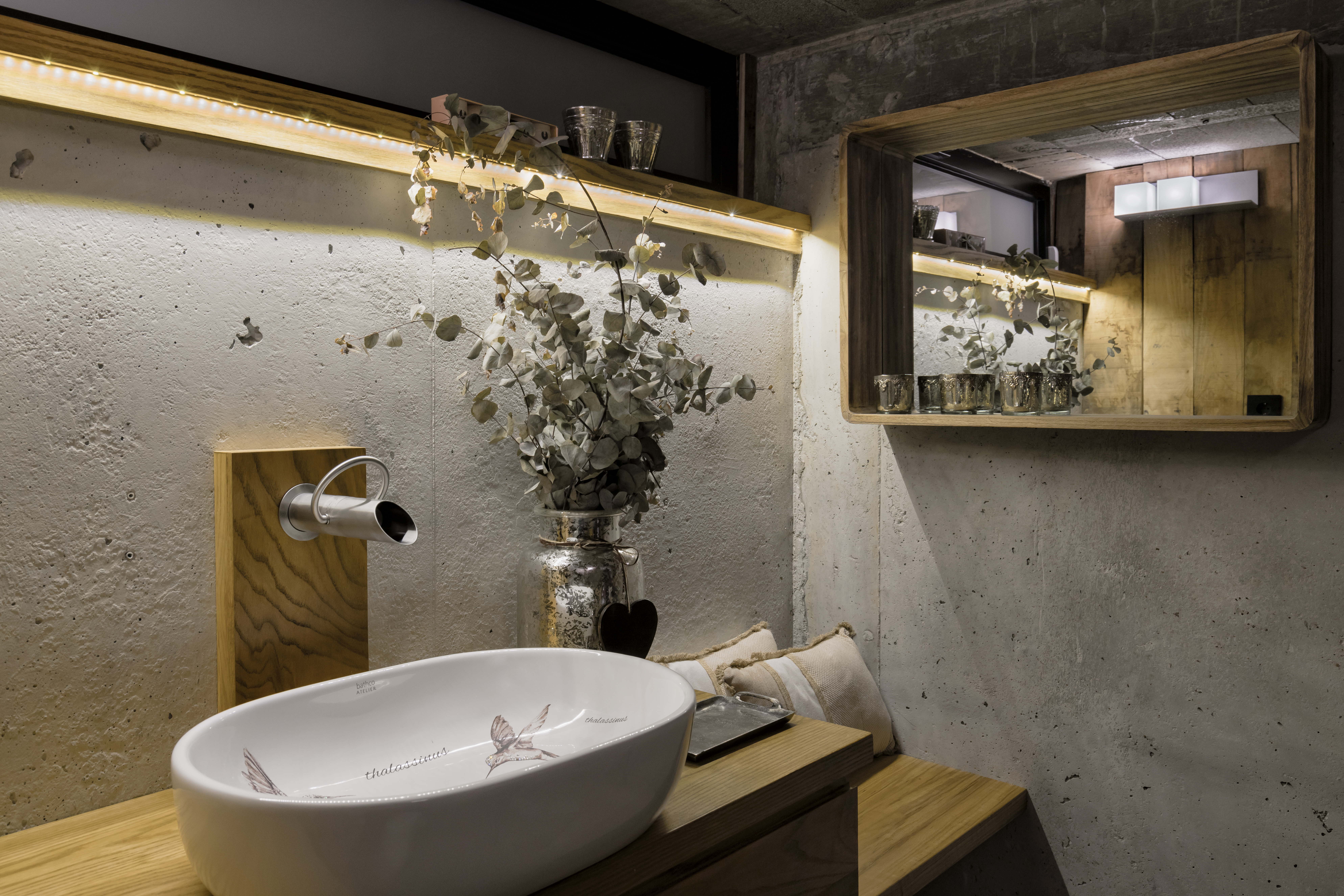 The sensation of turning on the tap and seeing the water stream over the glimmering Swarovski crystals of the Toulouse washbasin tattooed with birds, along with the rest of the pieces and materials that coexist in this lavatory, make it a very unique space.