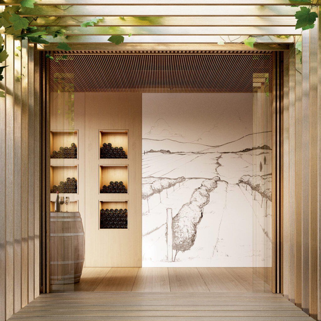 Entre estos viñedos encontramos nuestra bodega, con aire vanguardista sin perder su pasado y su tradición, rodeada de un paisaje incomparable en plena naturaleza.Un espacio en madera, en forma de cubos, sustracciones y vacíos, articulan todo el edificio. Donde la luz se administra mediante aberturas indirectas que la tamizan y hacen que bañe los cubículos de manera amable y tranquila. Entre la tierra y la madera, la interiorista vio la necesidad de contrastar con otros materiales que complementasen y evocasen el lugar donde se ubica esta bodega. Por ello, optó por elementos cerámicos, diseñados y hechos a medida, con su propio sello.