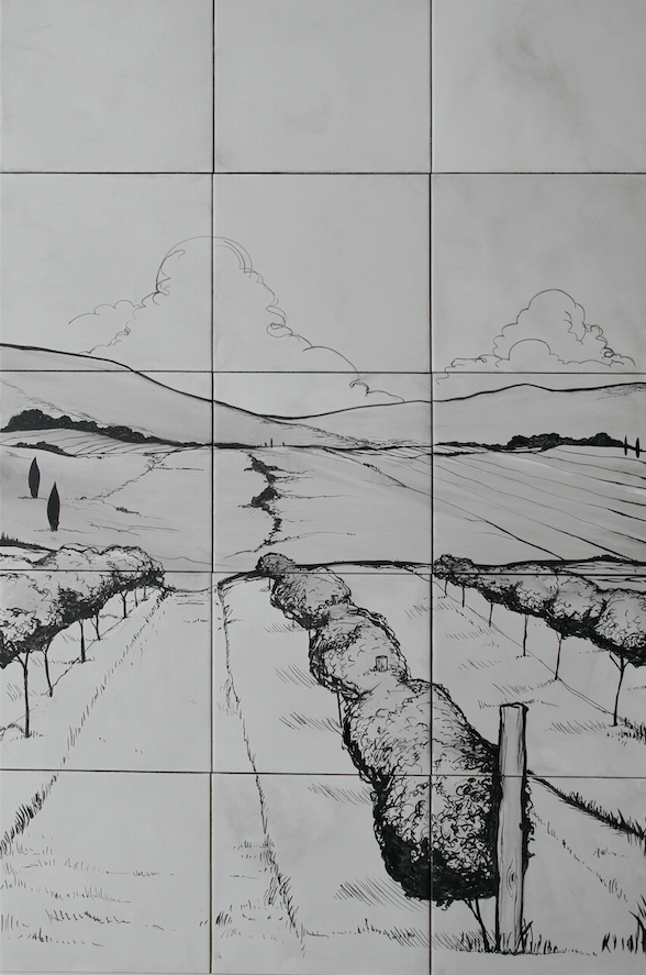 Se precisaba un mural que estuviese en el acceso al espacio de catas, que sirviese de preámbulo y lo vinculase con el exterior. Una panorámica del entorno con un aire de antaño que recordase al pasado. Para ello el artista, se inspiró en los grabados sobre la vendimia que se realizaban en el siglo XIX.