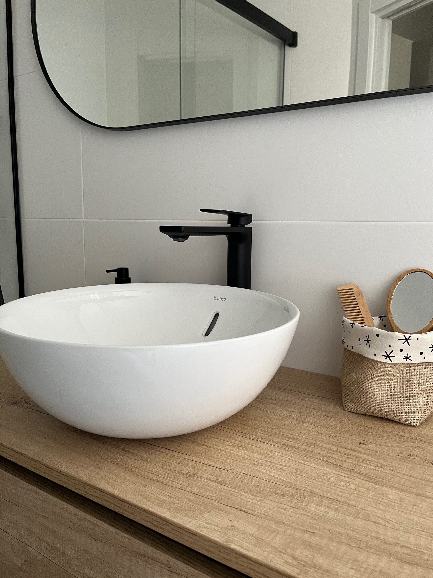 Cris nos cuenta que el baño de la primera planta “Ha quedado más bonito si cabe de lo que nos imaginábamos y lo mejor de todo, práctico, nuestro principal objetivo”. Eligieron azulejos sin rectificar blanco mate y los suelos se inspiran en los típicos azulejos hidráulicos. Sobre el mueble suspendido blanco y encimera de madera de Ikea se colocó el lavabo Bari de Bathco. Para el plato de ducha escogieron una mampara de cristal con marco negro.