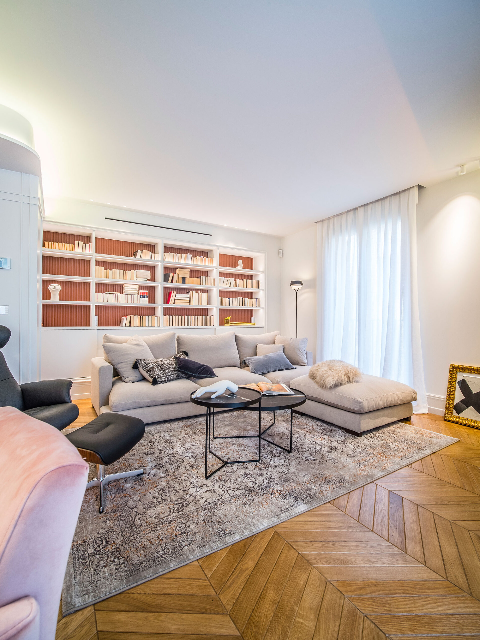 En la zona del salón destaca una pared en curva, realizada en madera contrachapada, en ella dos hornacinas rectangulares incluyen discretamente la televisión y la chimenea. La iluminación indirecta en todo el perímetro de esta pared acentúa la calidez de la madera y aporta más vida al conjunto. El marrón oscuro de la pared contrasta con las tonalidades suaves de una alfombra, un sofá y un puf en un tejido natural crudo, también con el gris perlado suave de las paredes, techos y librería trasera.
