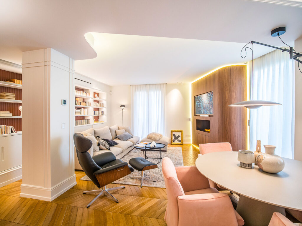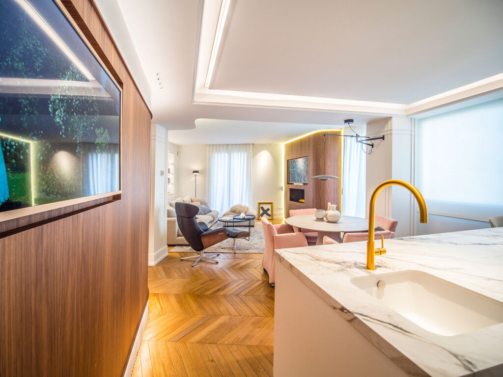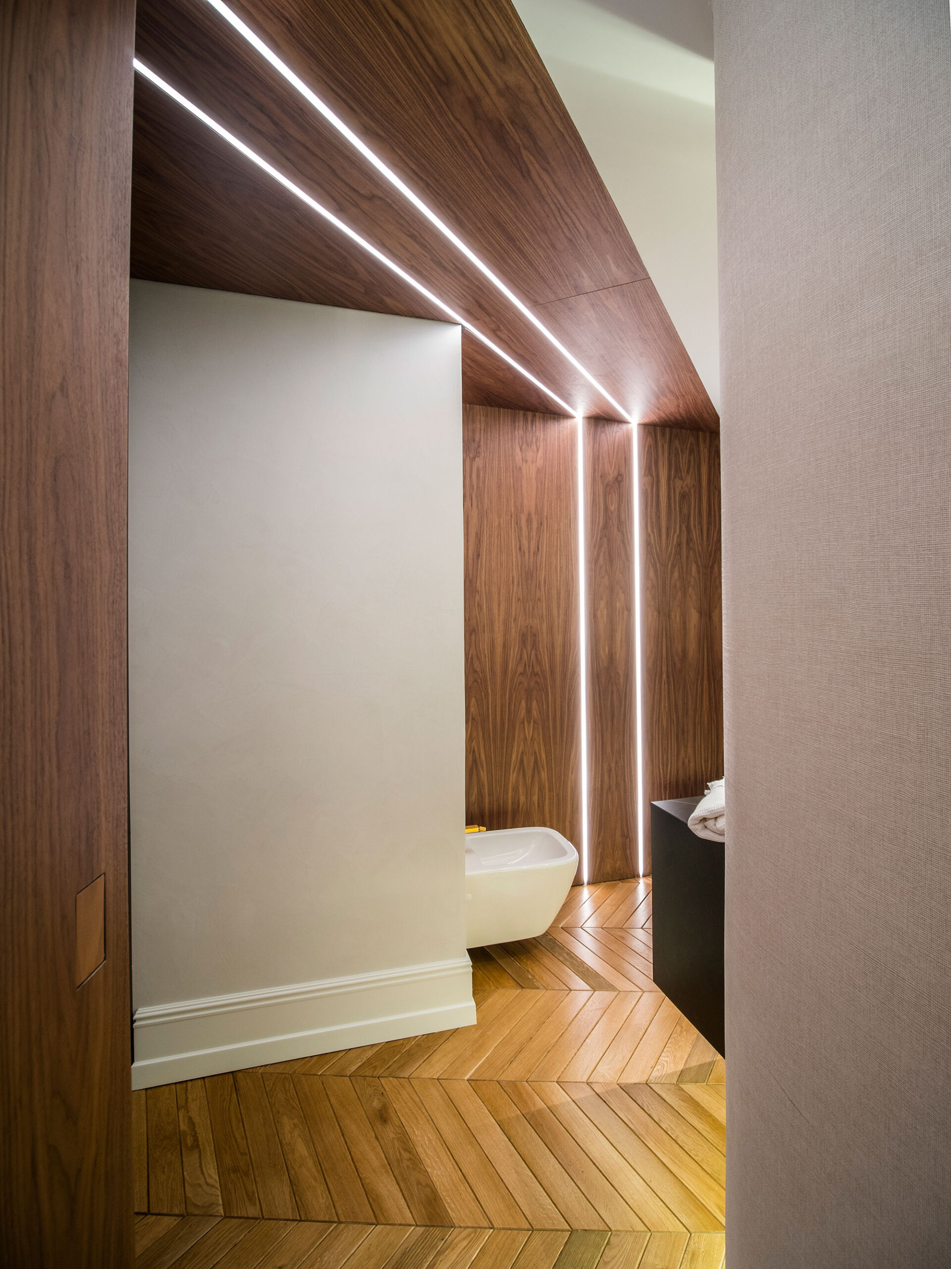 El trabajo de interiorismo se centró en algunos elementos clave utilizados en todas las estancias: madera noble, iluminación indirecta y molduras.