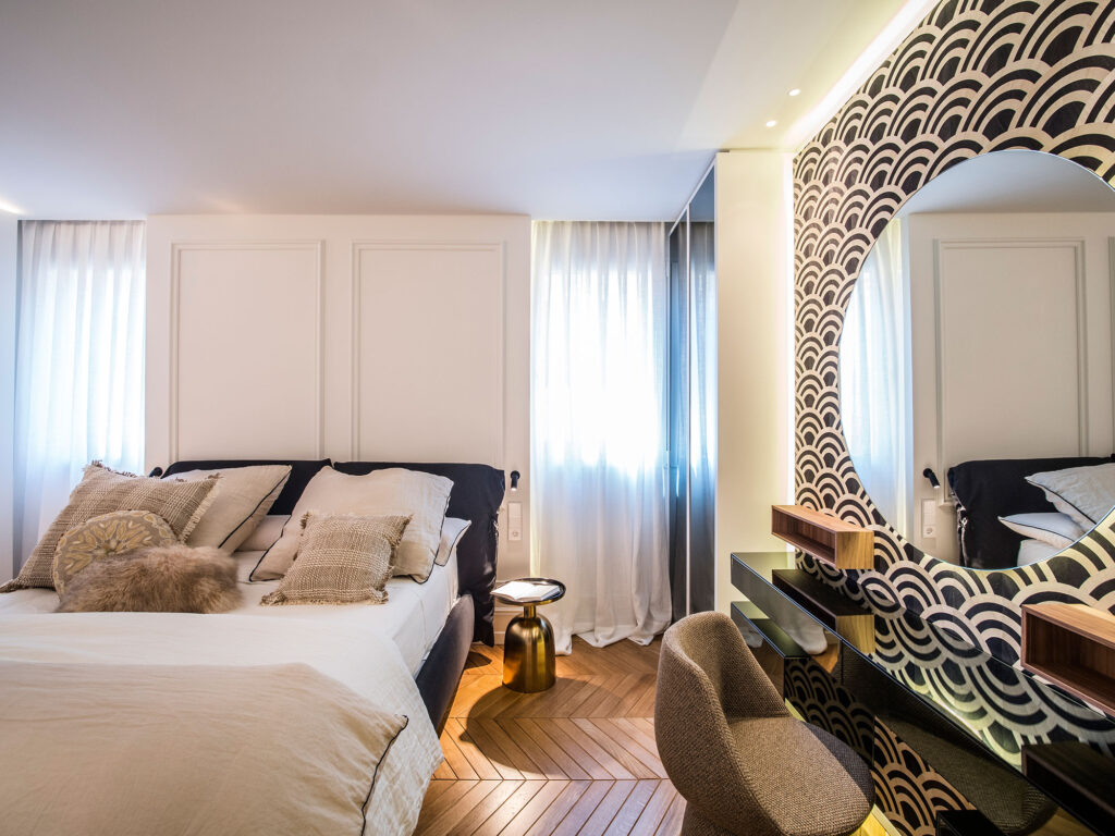 En la zona de noche, las tres habitaciones de la vivienda guardan armonía con el estilo atemporal de todo el piso. En el dormitorio principal los armarios emulan una pared blanca, gracias a la ausencia de tiradores. Un tocador con espejo redondo se ubica al otro lado de la cama, aquí la pared se ha revestido con papel pintado de un patrón de semicírculos en blanco y negro.
