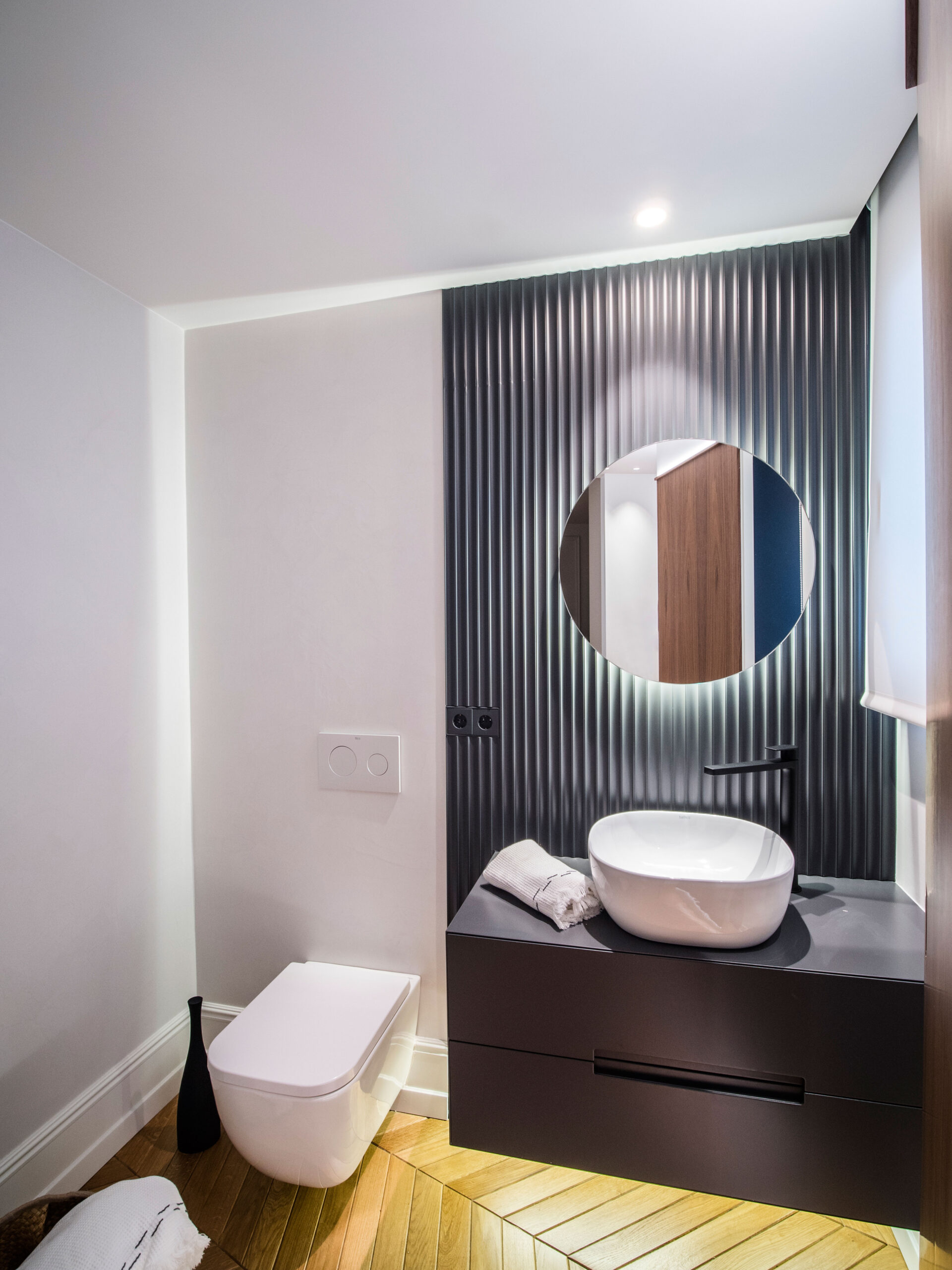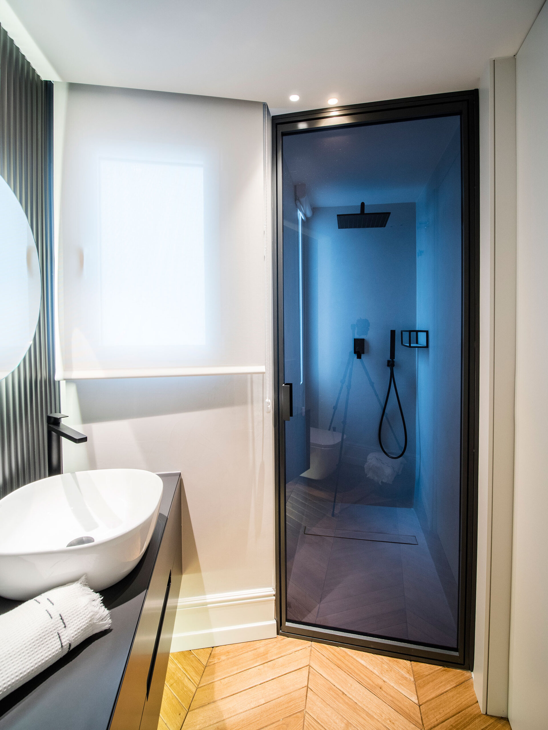 En el baño se combina el acabado madera con elementos negros y blancos, todo ello bajo una estudiada iluminación que pone en relieve cada pieza. El lavabo Olea rectangular se puede ver sobre mueble suspendido negro así como el bidé and the inodoro suspendido New Toledo.