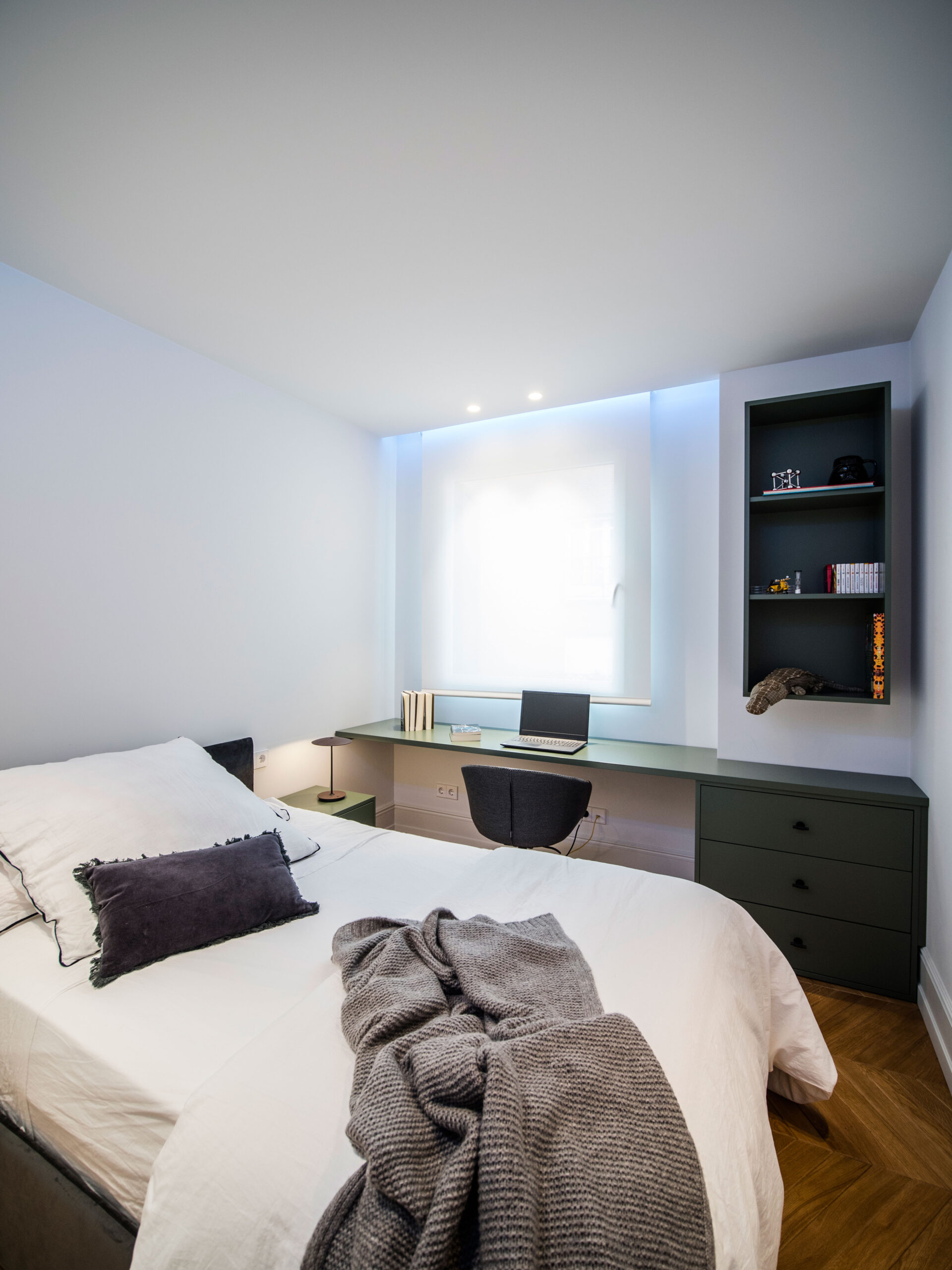 Las otras dos habitaciones, más juveniles, se han resuelto con mobiliario realizado a medida, tanto los armarios que quedan discretamente escondidos como los escritorios que van de pared a pared.