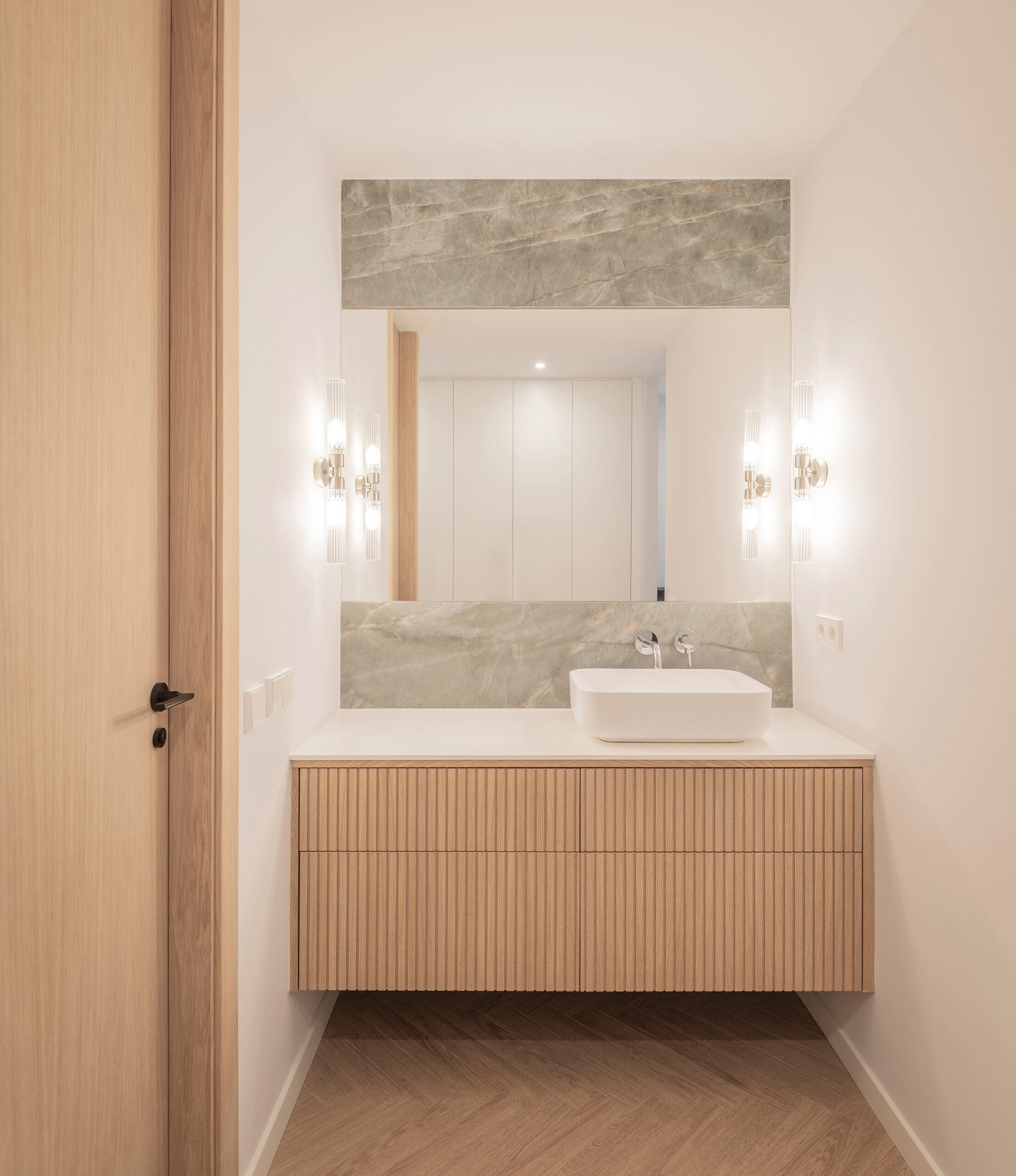 Con el objetivo de lograr una conexión visual cohesiva en toda la vivienda, se seleccionaron cuidadosamente materiales y colores que se complementaran entre sí. La paleta de colores elegida se basó en tonos neutros y luminosos, creando un ambiente fresco y luminoso en todas las áreas. Se hizo especial hincapié en los detalles, como en el aseo principal, donde el lavabo Nilo de Bathco se convirtió en el corazón del espacio. La incorporación de azulejos de porcelana en gran formato, un amplio espejo y un mueble a medida en palillería de roble resaltaron la importancia de esta área.