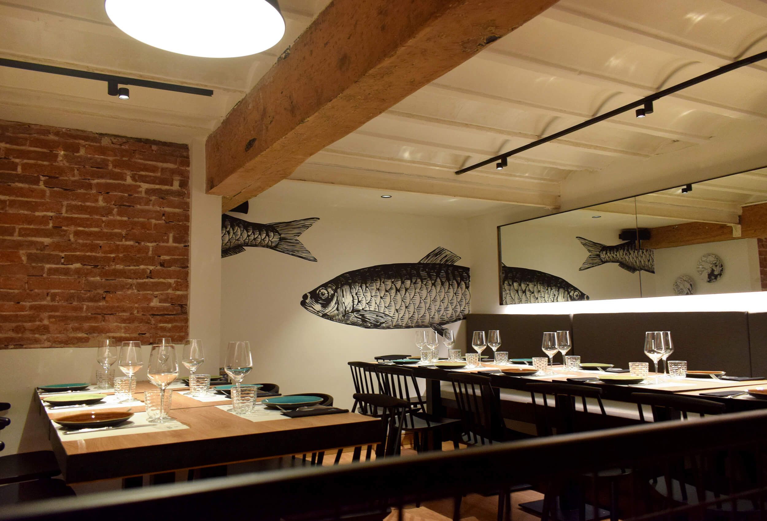 Uno de las intervenciones está ubicado en el acceso a los baños y fue realizado por Cecilio Espejo con trazos en blanco, negro y un tono azul verdoso o viridián a juego con los azulejos del propio baño. Las otras dos intervenciones se encuentran en el comedor superior. Sardinas en la pared principal y alcachofas, tomates y cebollas en otro de los rincones. Junto al mural de las sardinas se colocaron piezas cerámicas; dos platos intervenidos con calca cerámica que continúan la estética de la entrada a los baños.