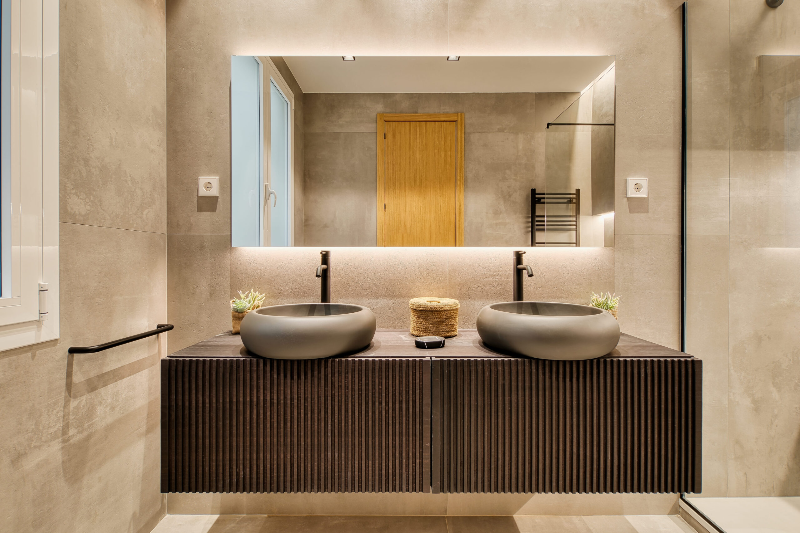 El diseño respira gracias a la cuidadosa elección de materiales. La nobleza de la madera se entrelaza con porcelánicos de gran formato, logrando una fusión de lo clásico y lo industrializado. Molduras en techos y paredes añaden una dimensión clásica, mientras que la decoración minimalista mantiene la elegancia sin excesos.