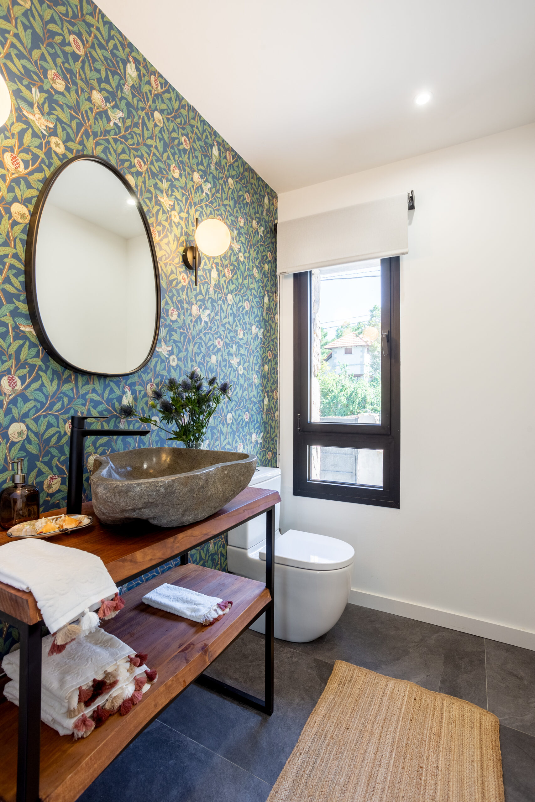 El aseo de cortesía es uno de los espacios más especiales de la vivienda. Aquí, el protagonista es el lavabo Río de Bathco, elaborado en piedra natural, que aporta textura y autenticidad al ambiente. La elección de este lavabo, junto con revestimientos en tonos neutros y detalles en madera, convierte el aseo en un espacio cálido y acogedor, ideal para recibir a los invitados.