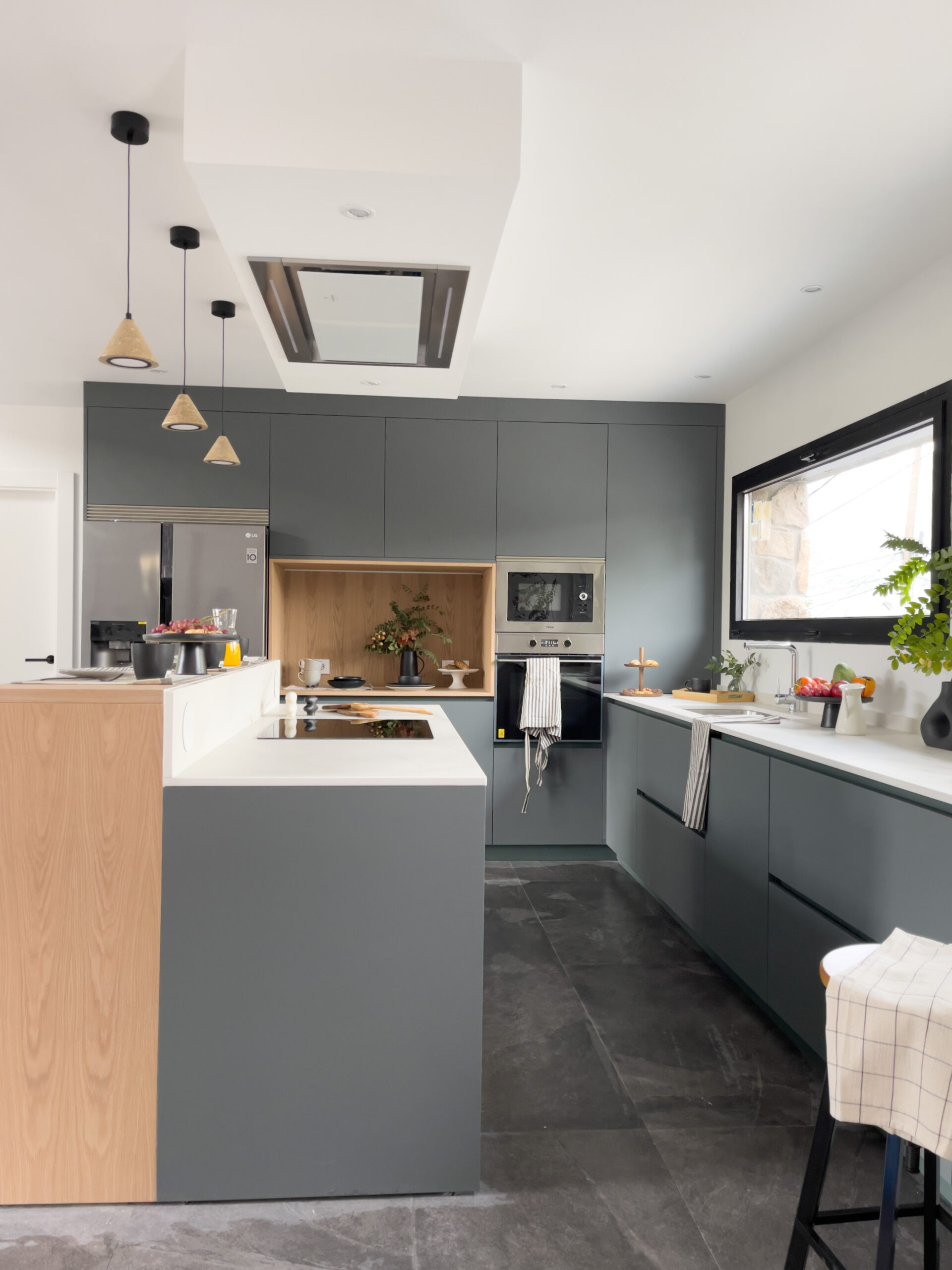 La cocina combina modernidad y rusticidad con un diseño en color verde laurel y detalles en roble natural. El espacio es funcional y elegante, perfecto para la vida familiar.