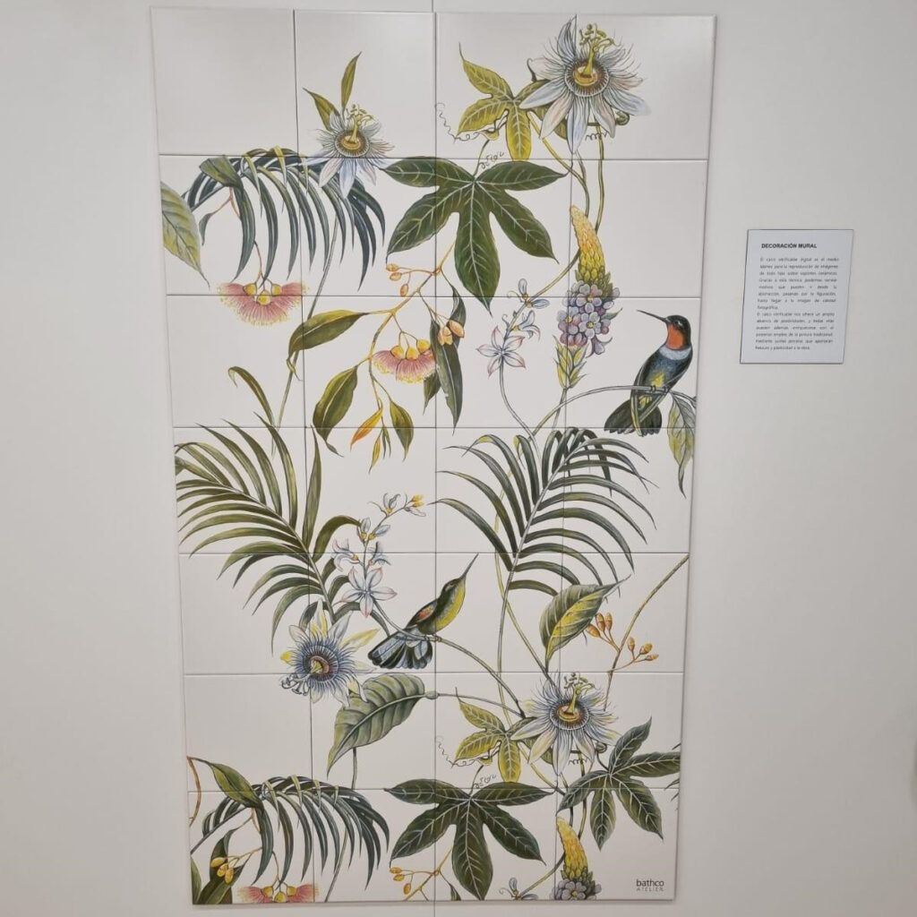 Los murales pintados son otra insignia del taller en el que se crea un nuevo diseño, se imprimen en calcas cerámicas y se aplican sobre azulejos que tras el horneadoconsigue piezas perdurables en el tiempo. Y si los artistas quieren dar un toque más realista, cogen los pinceles y aplican pigmentos cerámicos o incluso lumínicos que se veráncon luz ultravioleta. Aquí se instaló un mural con motivos vegetales.