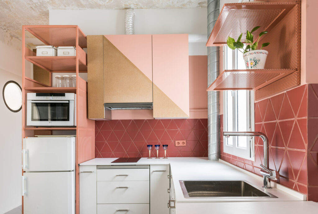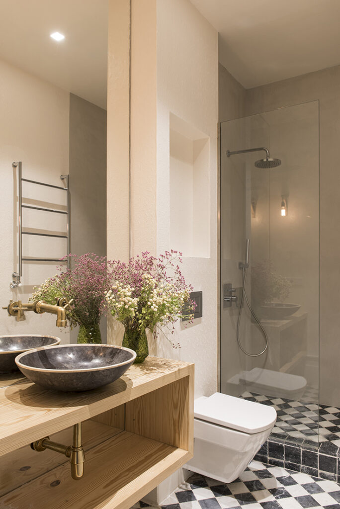 Los muebles de cocina fueron conservados, dándoles esa segunda vida, y se les aplicó un trabajo de pintura artesanal en los frentes de los armarios. “Se valoró especialmente la posibilidad de dar una segunda vida a objetos que, en principio, podrían parecer descartables”- comenta el estudio. La combinación de la paleta de colores y las texturas hacen que este proyecto tenga una armonía única. El gran ejemplo es en el cuarto de baño donde reposa el lavabo Río de Bathco. Estas soluciones de mobiliario económico ha permitido mantener la esencia original de la vivienda y añadir identidad al proyecto.