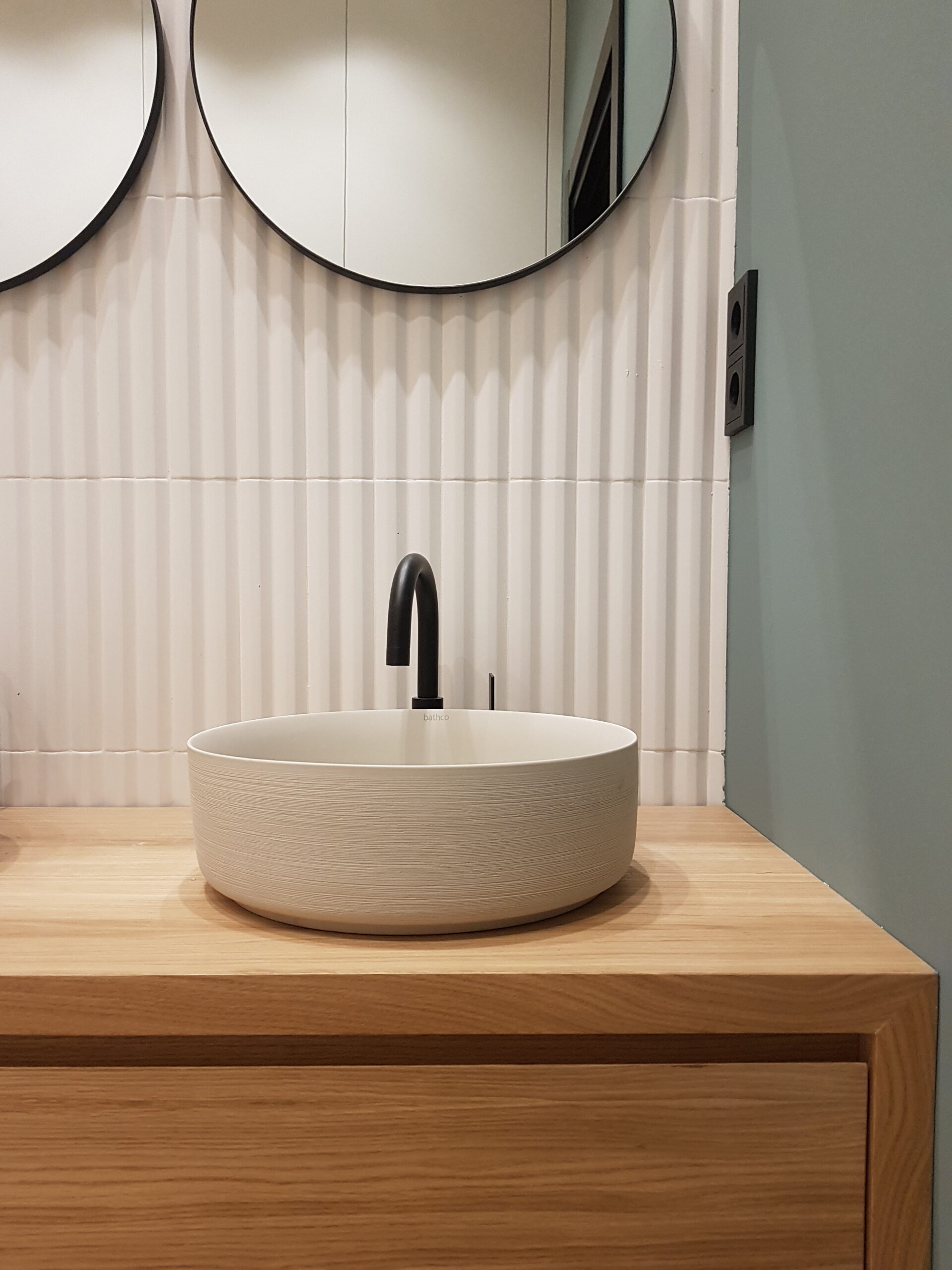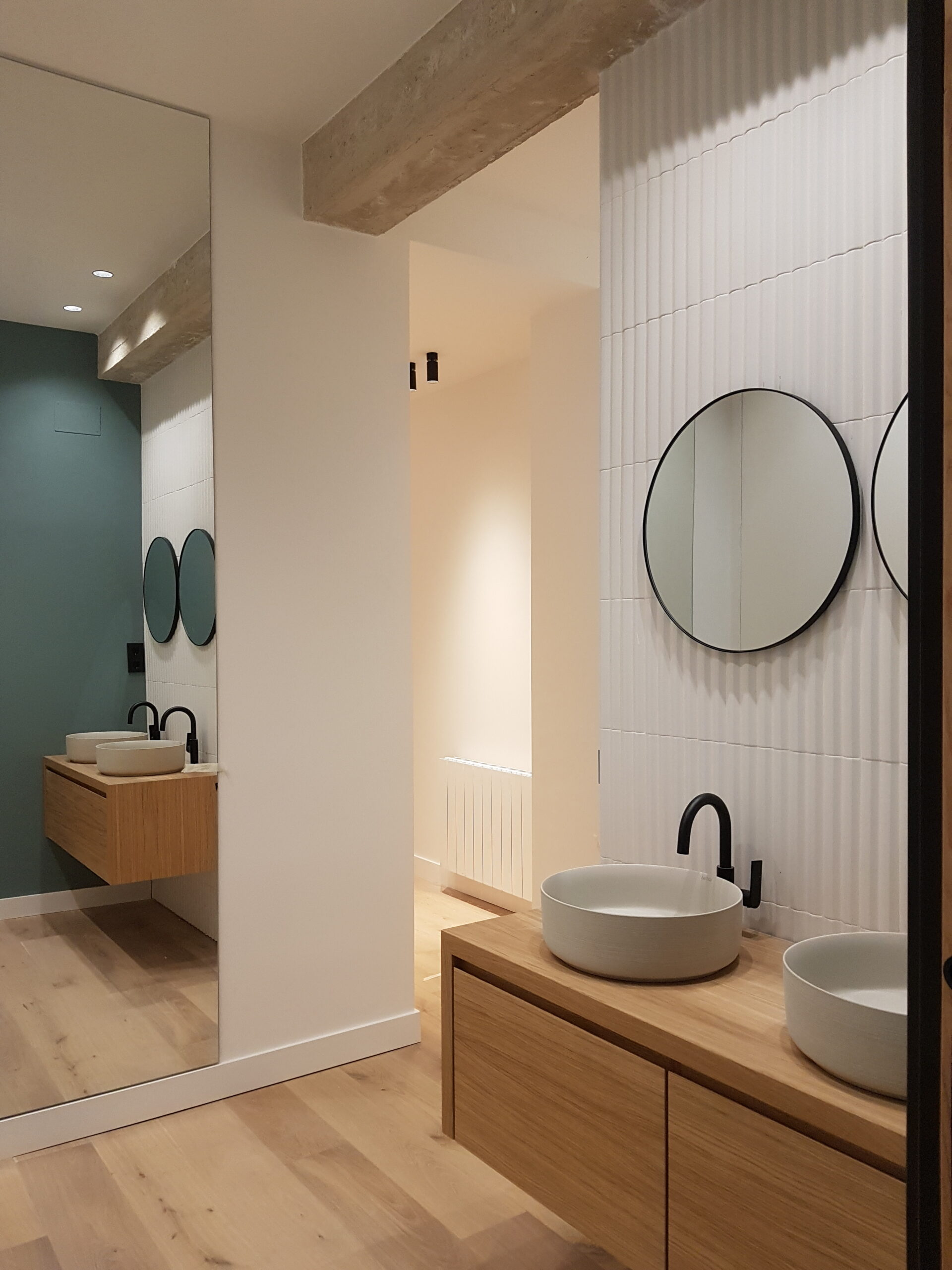 La viga de cemento corona la entrada al baño. Ahí se colocó un mueble suspendido de madera sobre el que colocaron dos lavabos sobre encimera Carnac de Bathco. Este modelo se presenta en porcelana natural liso en su interior y abujardado en el exterior. Este frente se termina con grifería negra, espejos redondos y azulejo con relieve.