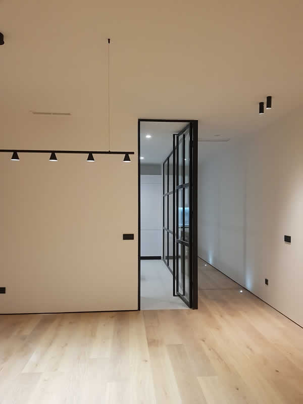 El arquitecto de B+J arquitectos, Juan Fdez.-Turégano Pérez, detalla que “en esta reforma integral se apostó principalmente por la apertura del espacio y la «descomposición» del pasillo existente, rompiendo la esquina de la cocina con una mampara de vidrio. Detalles como el rodapié sombra, las vigas vistas de hormigón encontradas durante la ejecución, el lavabo contenido en el vestidor o la iluminación desde el suelo, hacen de esta vivienda un proyecto singular”.