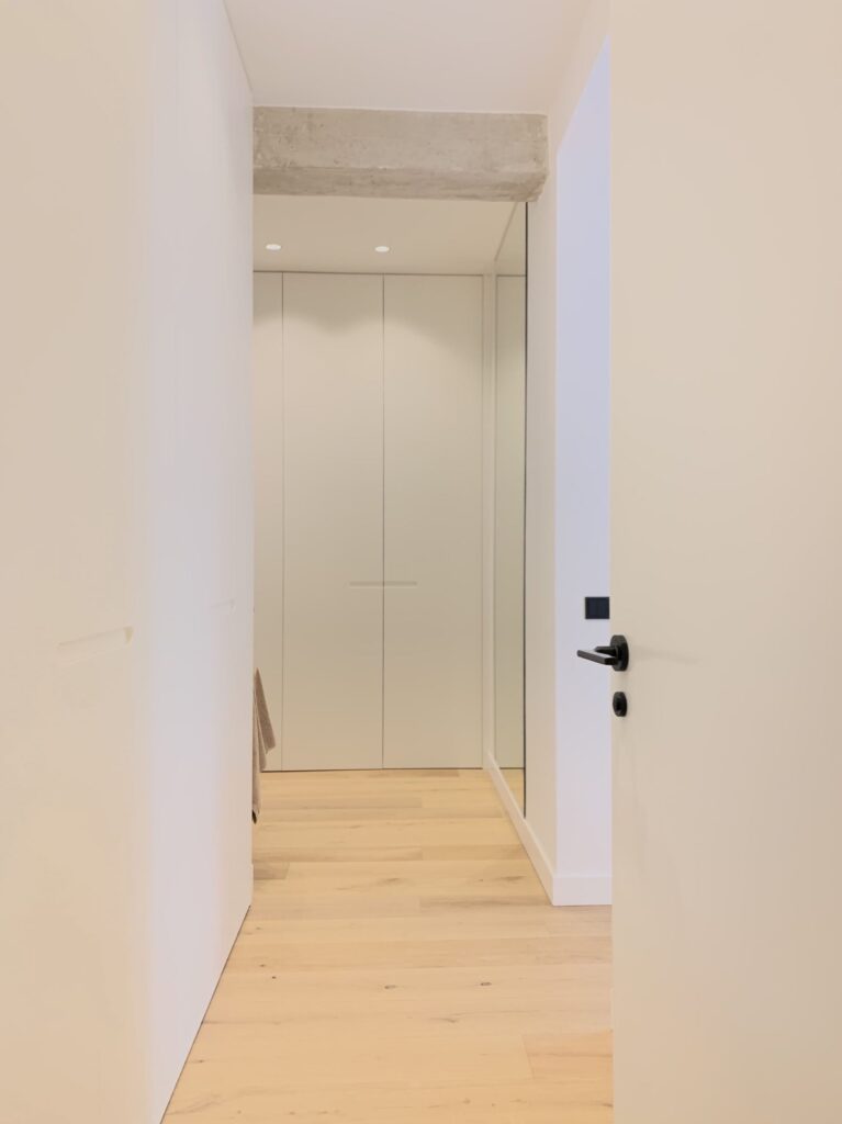 En este pasillo se puede ver el rodapié sombra generando una única línea que recorre el perímetro de la zona noble. Las vigas vistas de hormigón encontradas durante la ejecución imprimen de carácter el acceso al dormitorio principal y el baño.