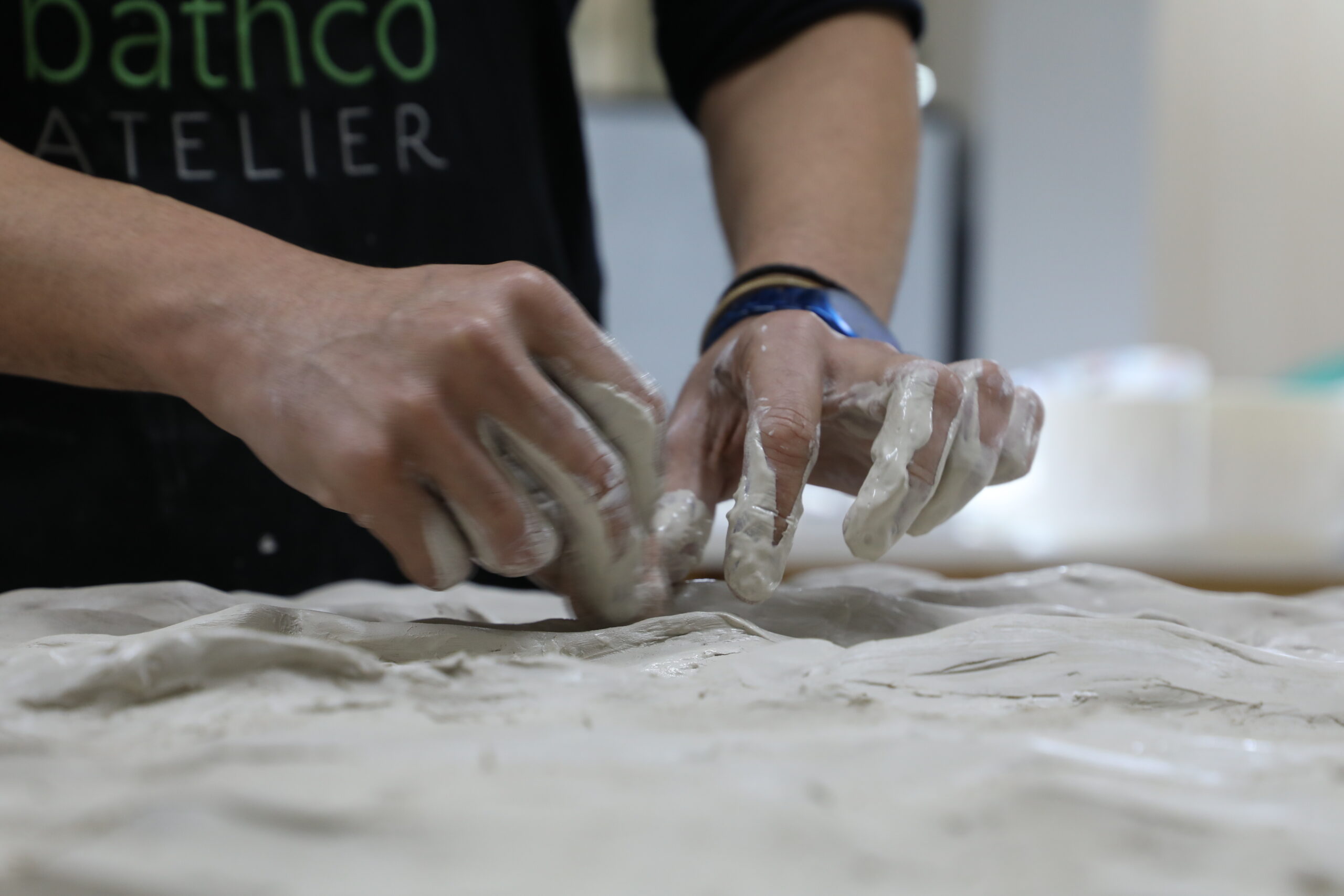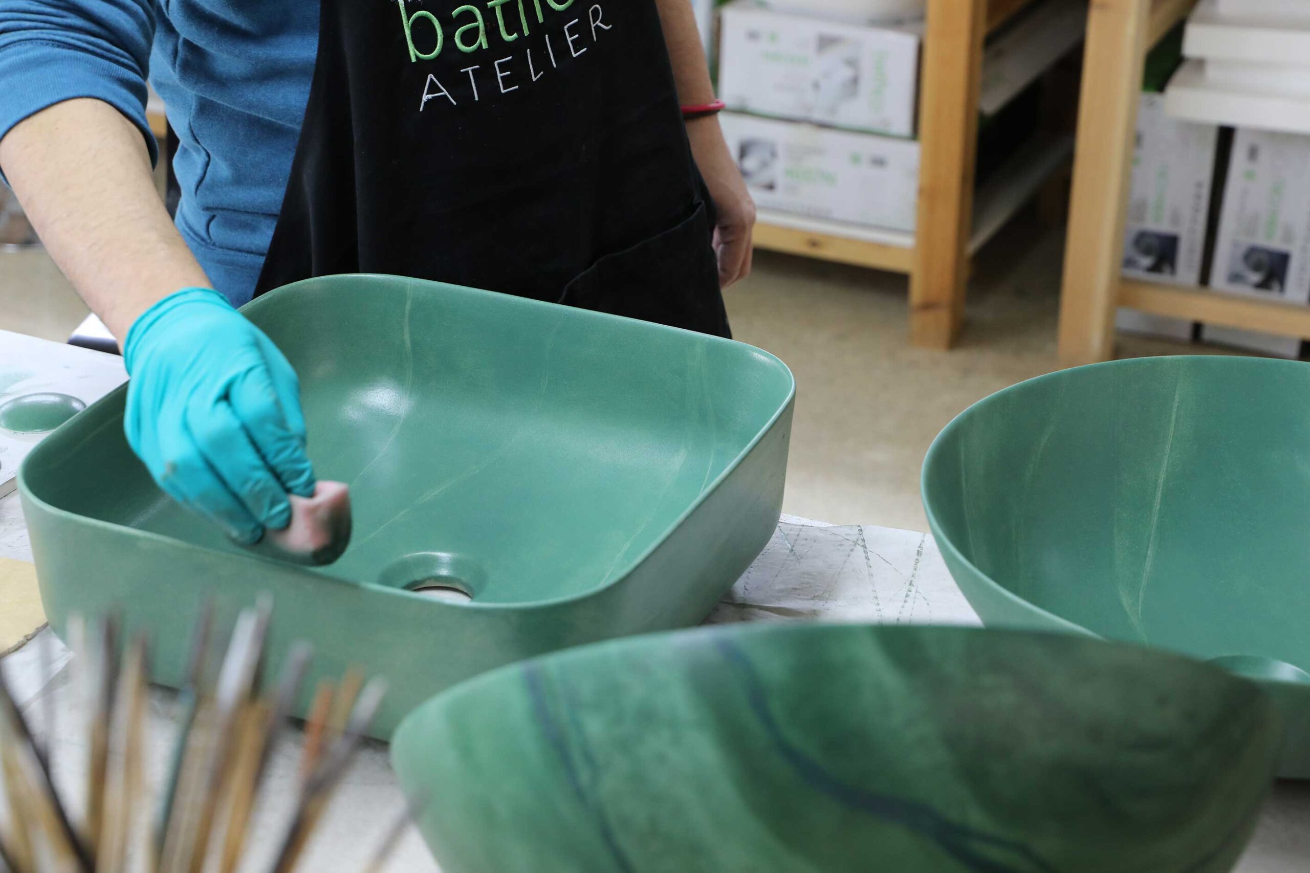 Dentro del Atelier de Bathco se realiza un trabajo de investigación constante. Cada proyecto que llega es un nuevo reto para los seis artistas que componen actualmente el taller. Por eso, es habitual verlos mezclar o experimentar con materiales que a priori poco tienen que ver con un lavabo como son (tierra, vidrios, arenas, metales…).