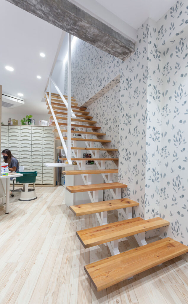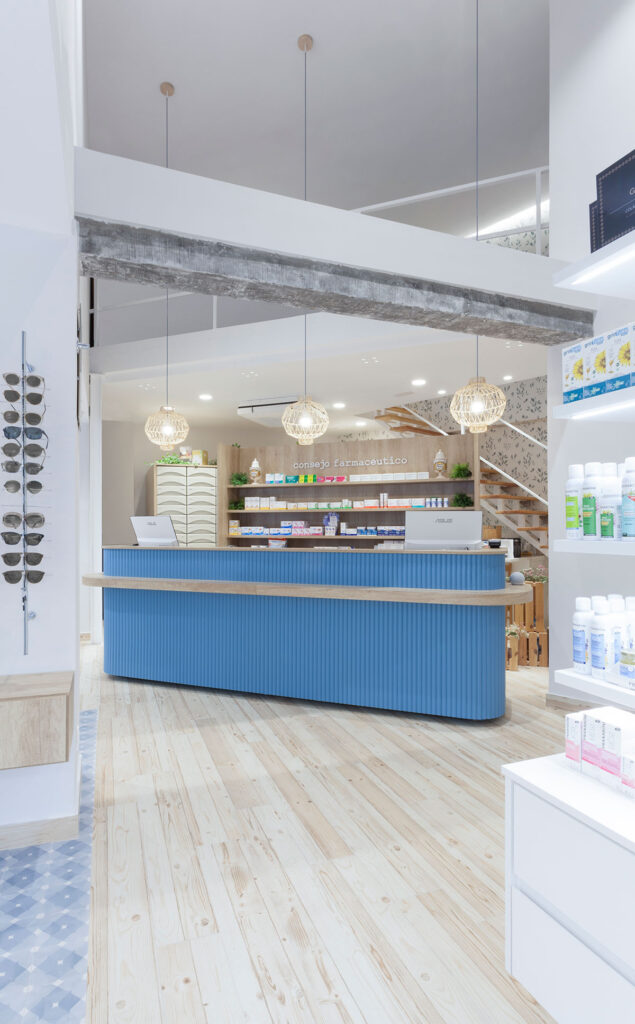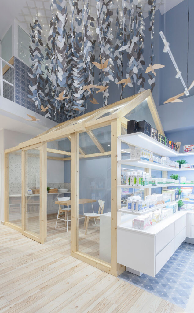 En el espacio a doble altura, encontramos una casita hecha de madera y vidrio que sirve para aportar intimidad a las consultas de dietética o atención farmacéutica. Sobre ella, una gran bandada de pájaros realizados en madera y entrelazados con lianas de papel, sobrevuelan el espacio, y le dan ese toque bucólico que se buscaba con el proyecto. La zona de mostradores, se equipa con una pieza realizada a medida y revestida en orac, lacada en azul, que se convierte en centro de las miradas. Un panel tras ella, divide con la zona de rebotica. La zona de la planta alta, alberga actualmente el pequeño laboratorio donde realizan fórmulas magistrales y una zona de despacho.
