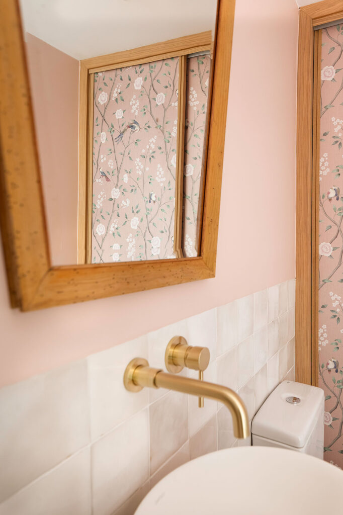 Las baldosas porcelánicas acaban de dar personalidad a la estancia y las paredes en rosa crepe y el alicatado vintage aportan luminosidad.