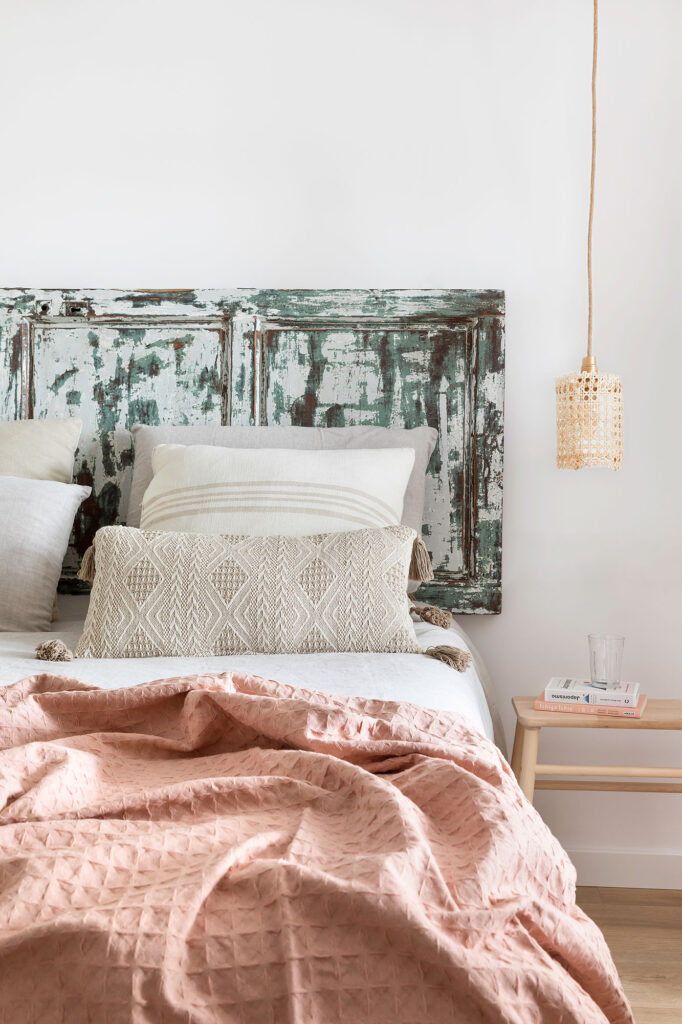 En la zona de noche encontramos el dormitorio principal con un cabecero hecho con una puerta antigua, colchón de Domotex y cama de Maisons du Monde. La ropa que la viste es de Calma House.