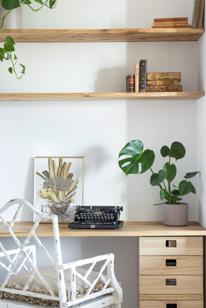 La zona de día tiene una esencia ecléctica; en el salón encontramos un tapiz de macramé de Fruto Samore sobre el sofá Chester y la alfombra Tribu natural XL de Lorena Canals Rugs. Los muebles de almacenaje son de Asti Deco, las mesas y estanterías hechas a mano por un carpintero local, el menaje de Muy Mucho y las plantas de Colvin.