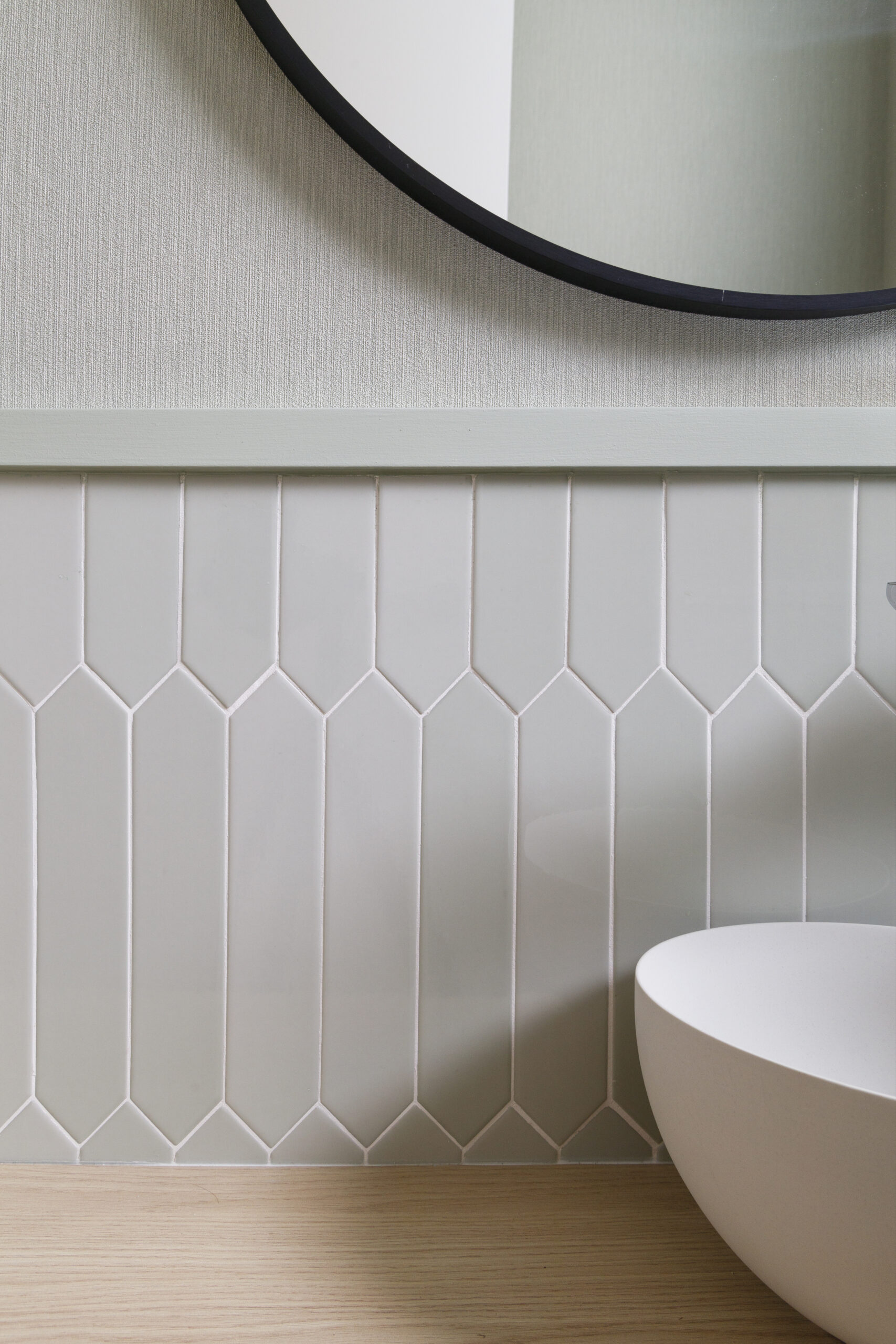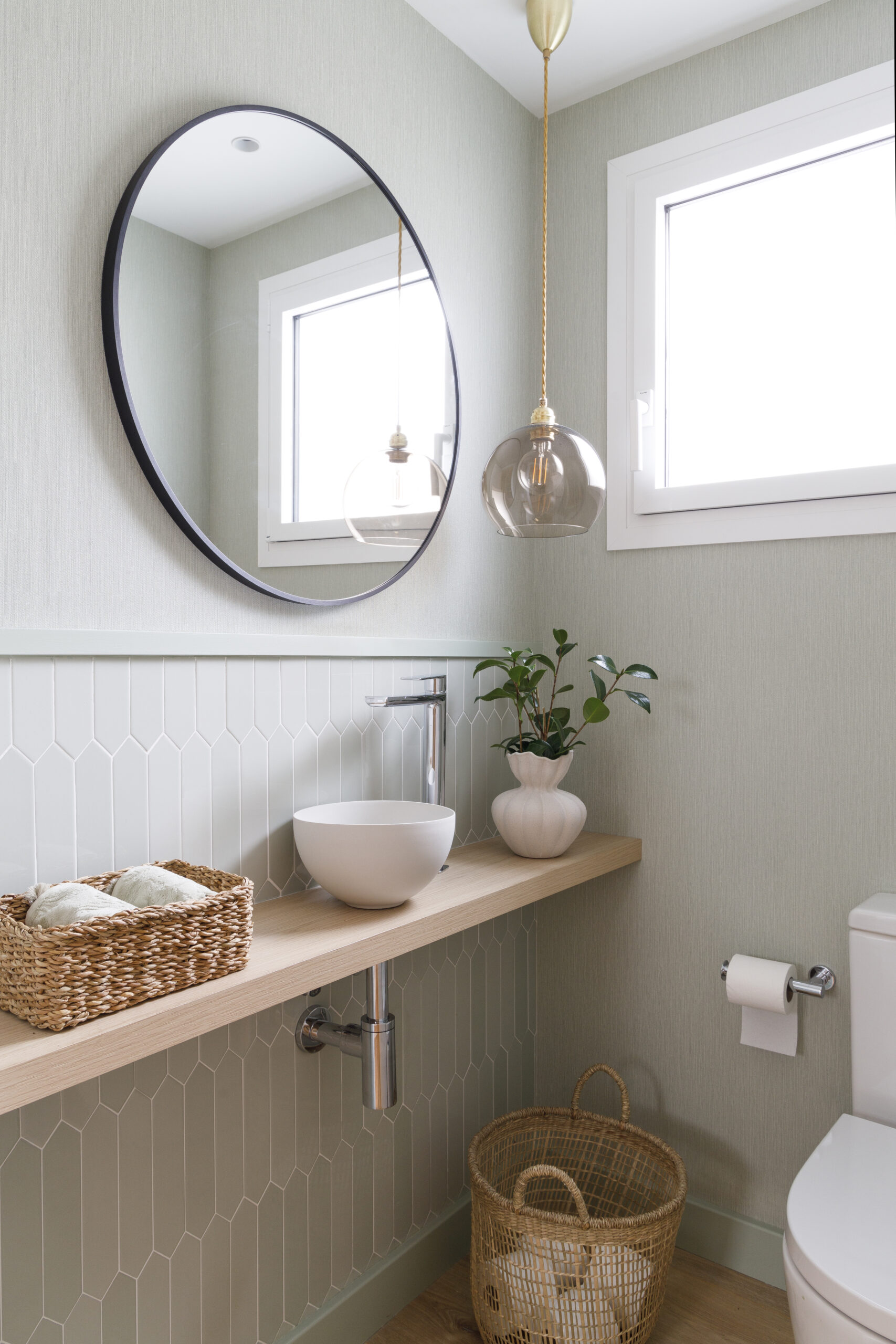 - Baño de cortesía: Este espacio compacto destaca por el lavabo Mini Lys from Bathco, complementado por una repisa volada de madera y un espejo redondo con perfil negro que aporta un toque moderno.