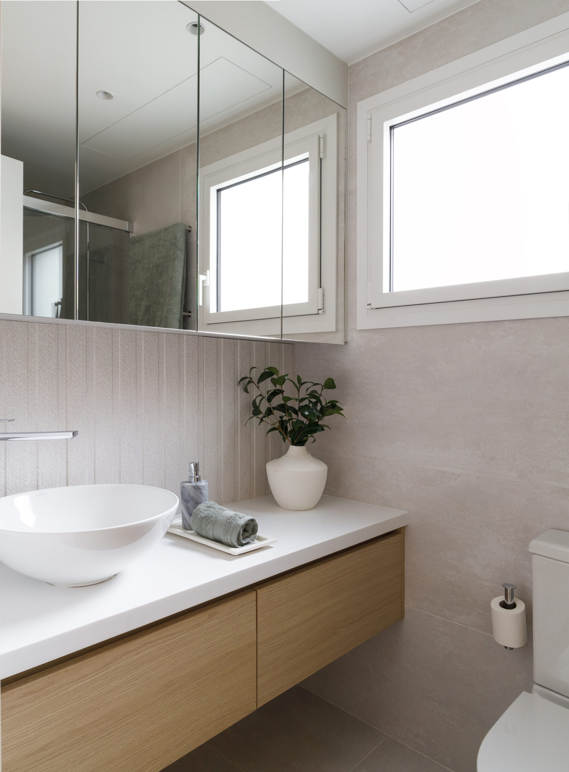 - Baño principal: Incluye el lavabo New Lys from Bathco sobre un mueble flotante de roble, que optimiza el almacenamiento y aligera el espacio. Los espejos con armarios integrados suman funcionalidad sin sacrificar el diseño.