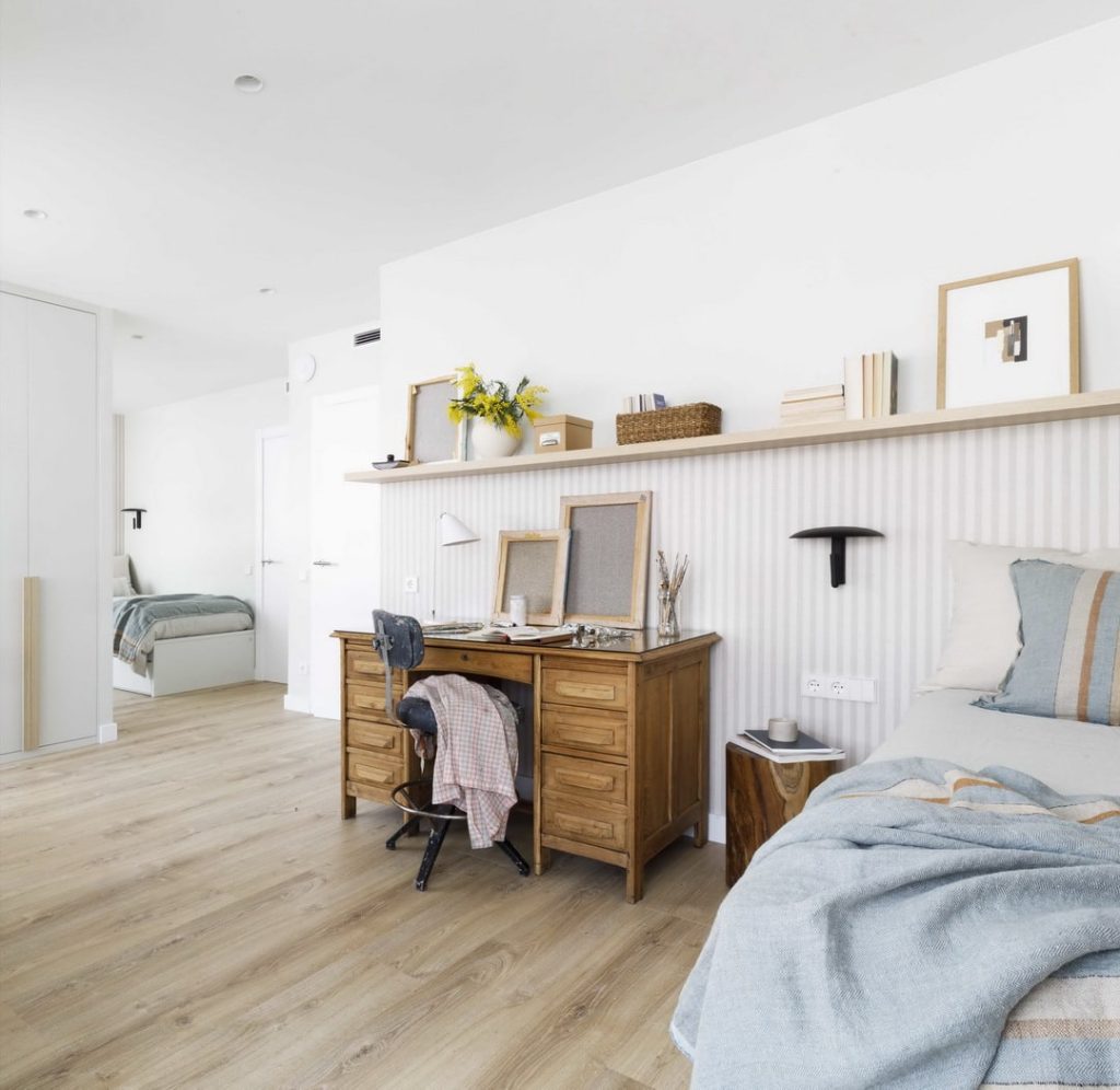 - Dormitorio principal: Se amplió para incluir un vestidor y un lineal de armarios, mientras que detalles como el cabecero con repisa e iluminación indirecta aportan calidez y practicidad.
