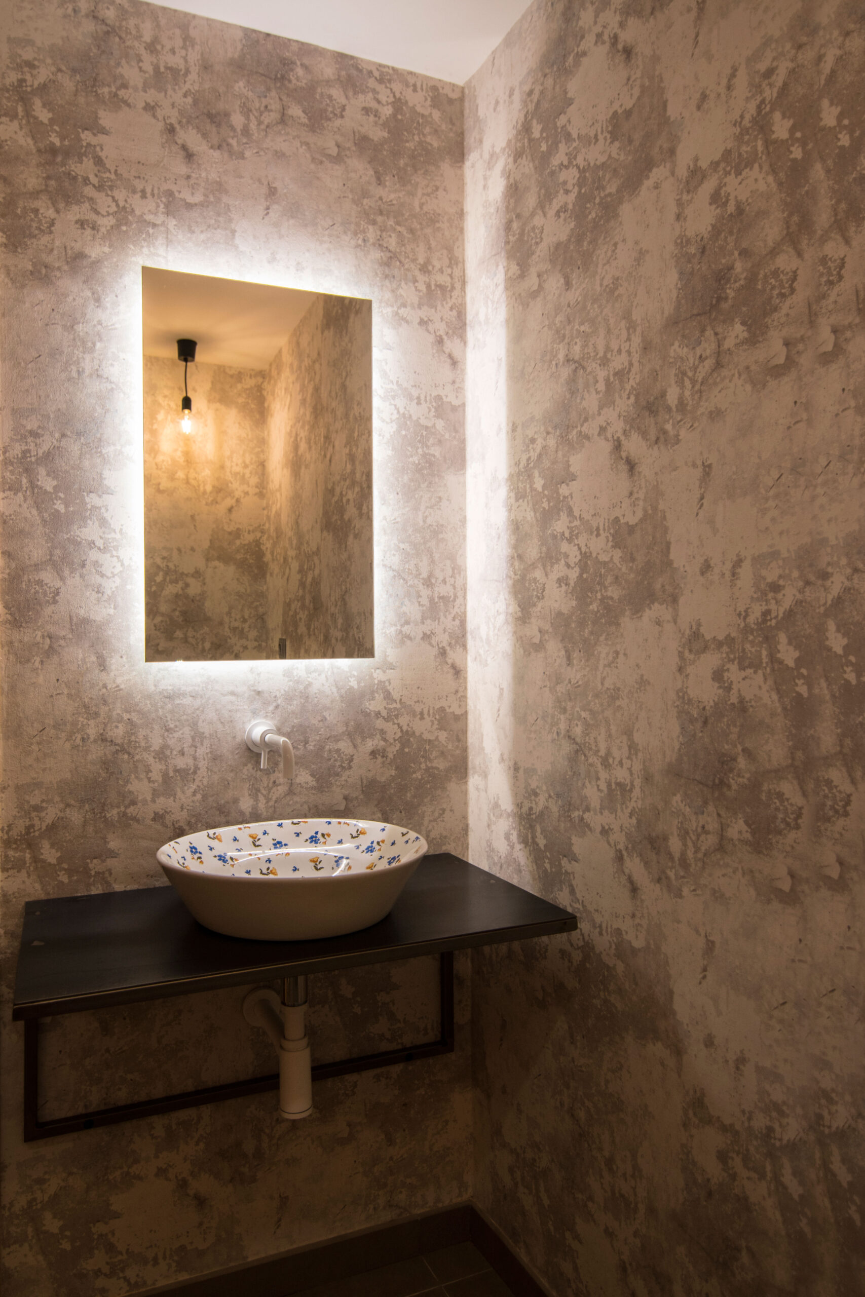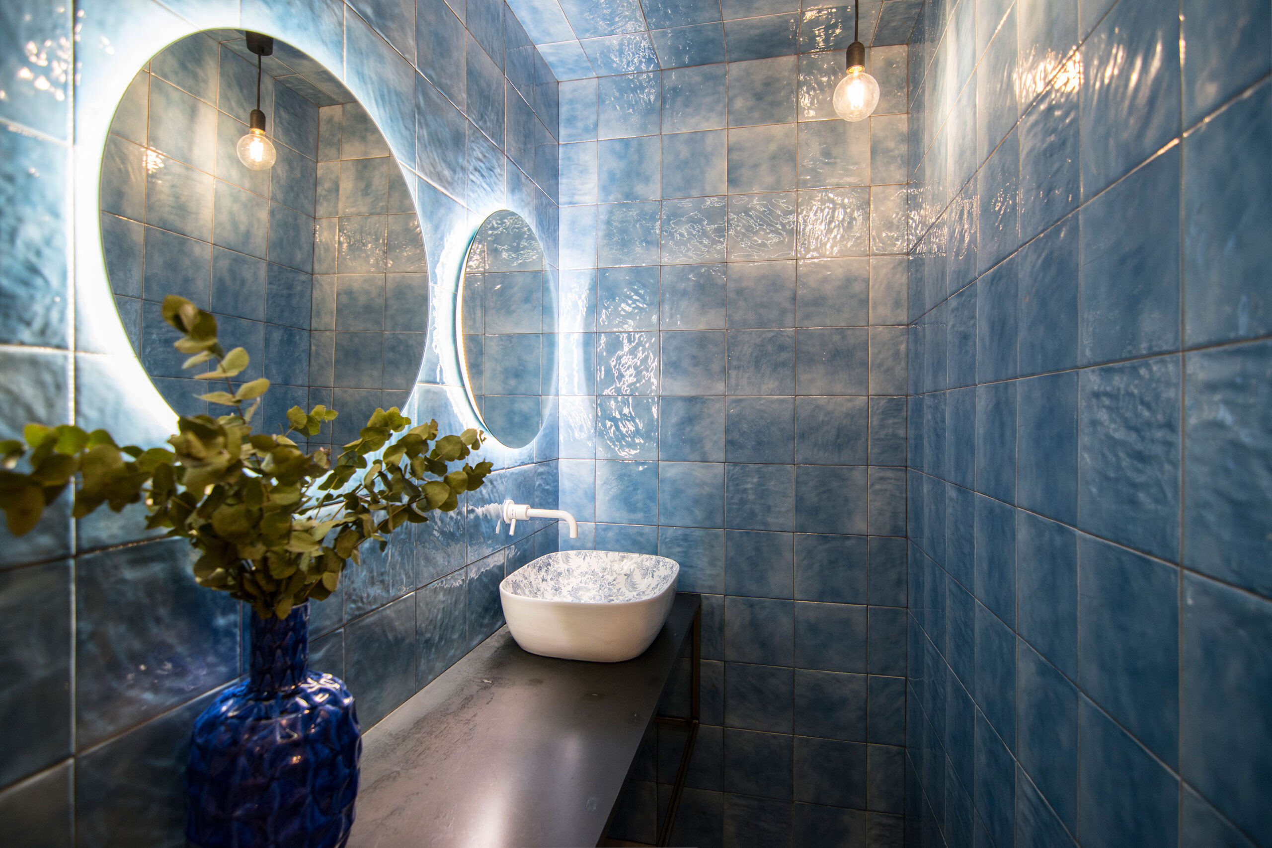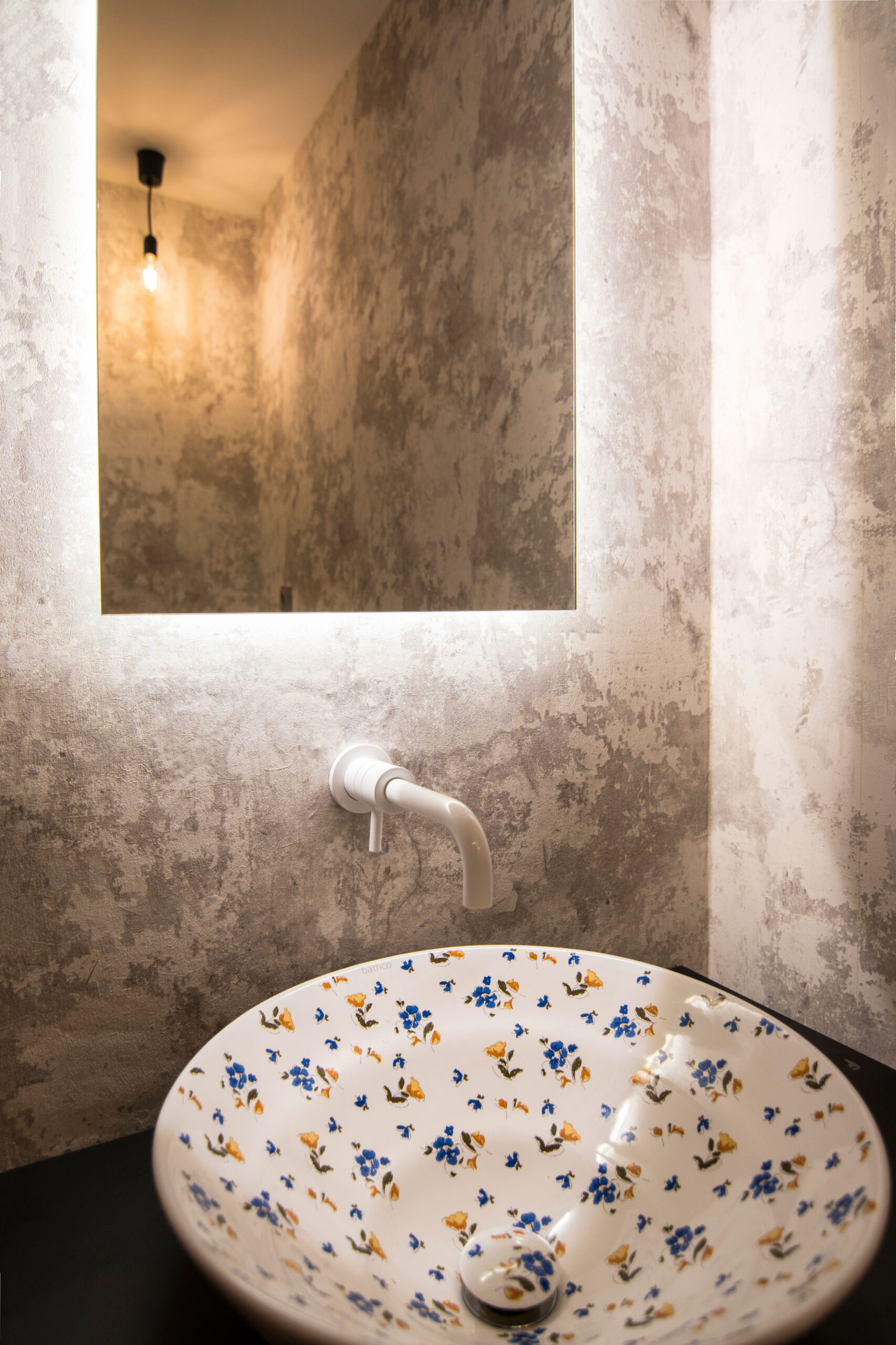 En los baños del restaurante se ven tres ejemplos de cómo el trabajo artesanal pone en valor un proyecto que busca la diferenciación. Javier Chulvi explica su trabajo, “el rediseño de los baños ha sido realizado y planteado desde los orígenes. El alma material y artesanal del paso del tiempo embauca el entorno, remarcando y destacando los recovecos con piezas cerámicas de diseño. La presencia de los vitrales de color, el mosaico hidráulico, las balaustradas de forja y el estilo de los lavabos artesanales y de alta calidad, hacen homenaje a una época pasada que no queremos olvidar. La incorporación de elementos decorativos y cuidadosamente distribuidos respetando y potenciando la intencionalidad, ayuda a entender la filosofía planteada”.