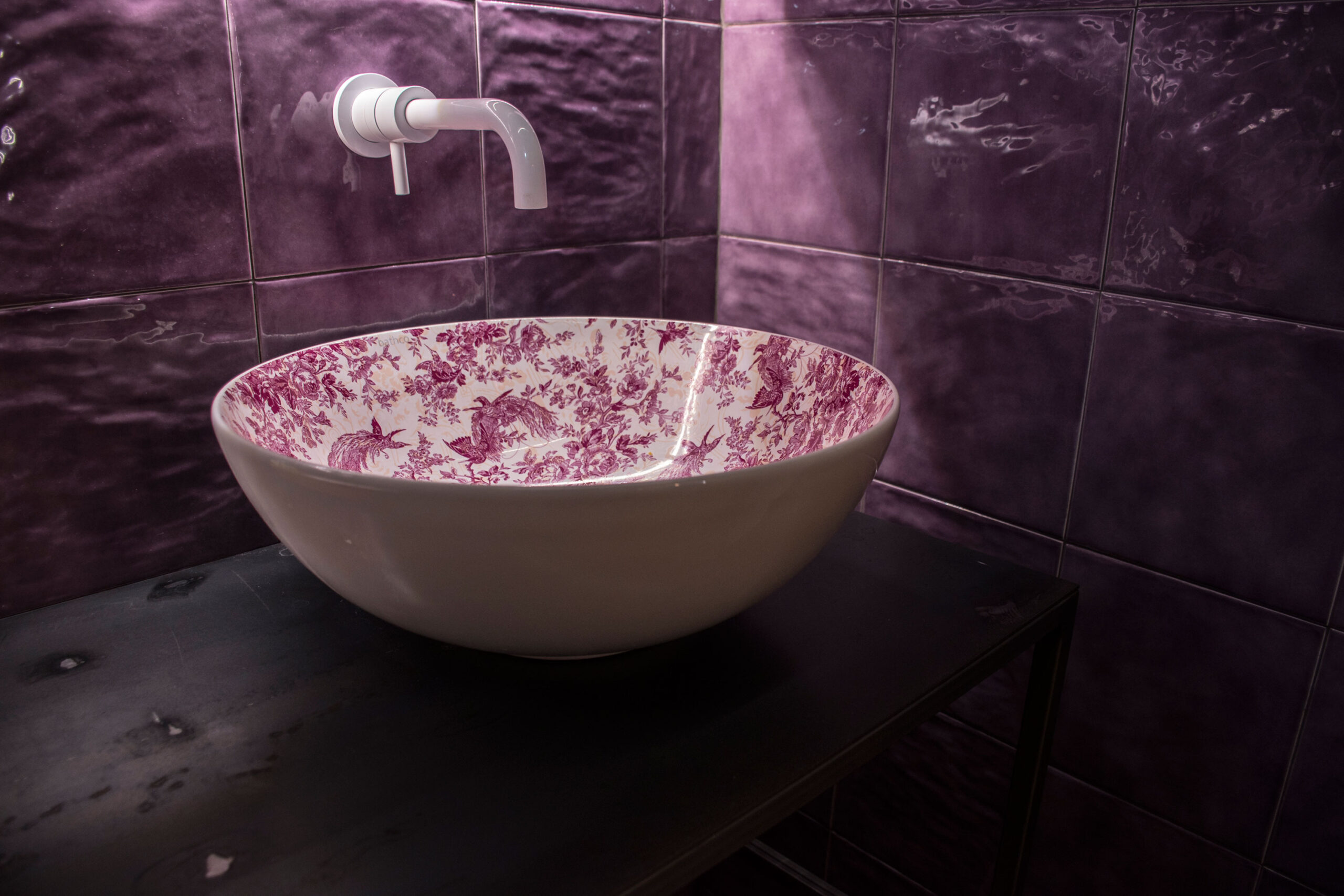 Ahí se encuentran los lavabos decorados con calcas cerámicas por los artesanos de la empresa Bathco que se escogieron para completar los espacios. En primer lugar se encuentra el lavabo New Lys decorado en Toile de Jouy rojo. En el baño decorado en tonos azules encontramos el modelo Olea rectangular estampado con Toile de Jouy azul. Por último, vemos la referencia de semiencastre Nápoles con el decorado L´Forest.