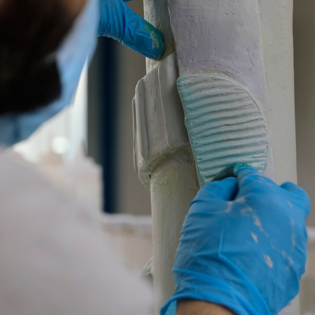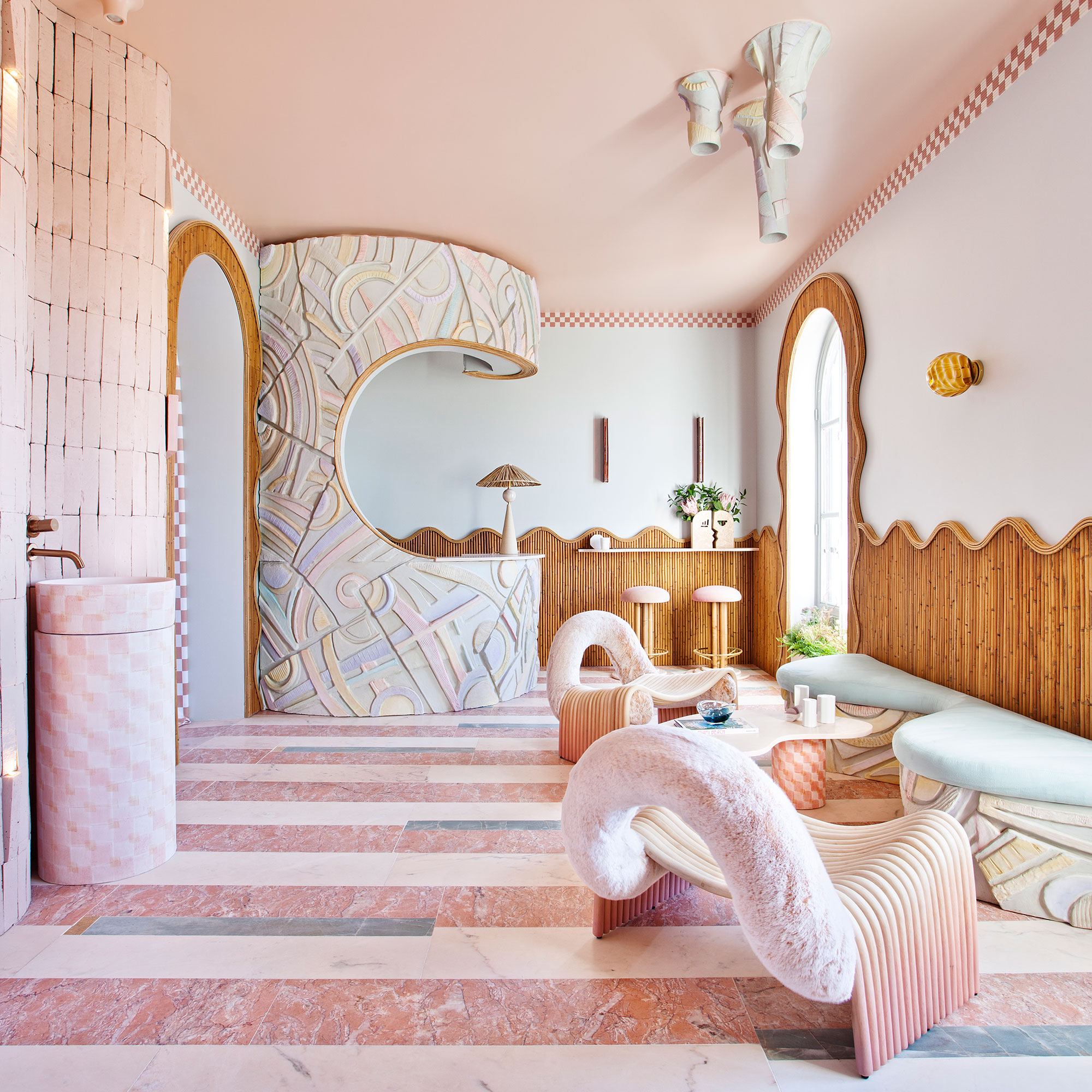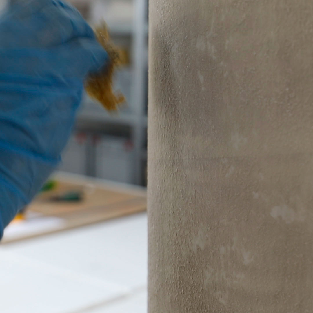 Patricia Bustos Studio diseñó dos muebles para el espacio “Tacto sereno” inspirados en el brutalismo arquitectónico: un mostrador de 3,13 x 2,80 m. y un banco de 2,10 x 0,32 m.Los artistas del Atelier se encargaron de reproducir ambas piezas para recubrirlas posteriormente con cerámica. Finalmente aplicaron una pátina para dar unaspecto envejecido, las pintaron en degradado con tonos poco saturados y las terminaron con una fina pátina dorada.