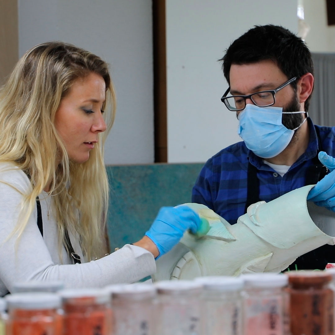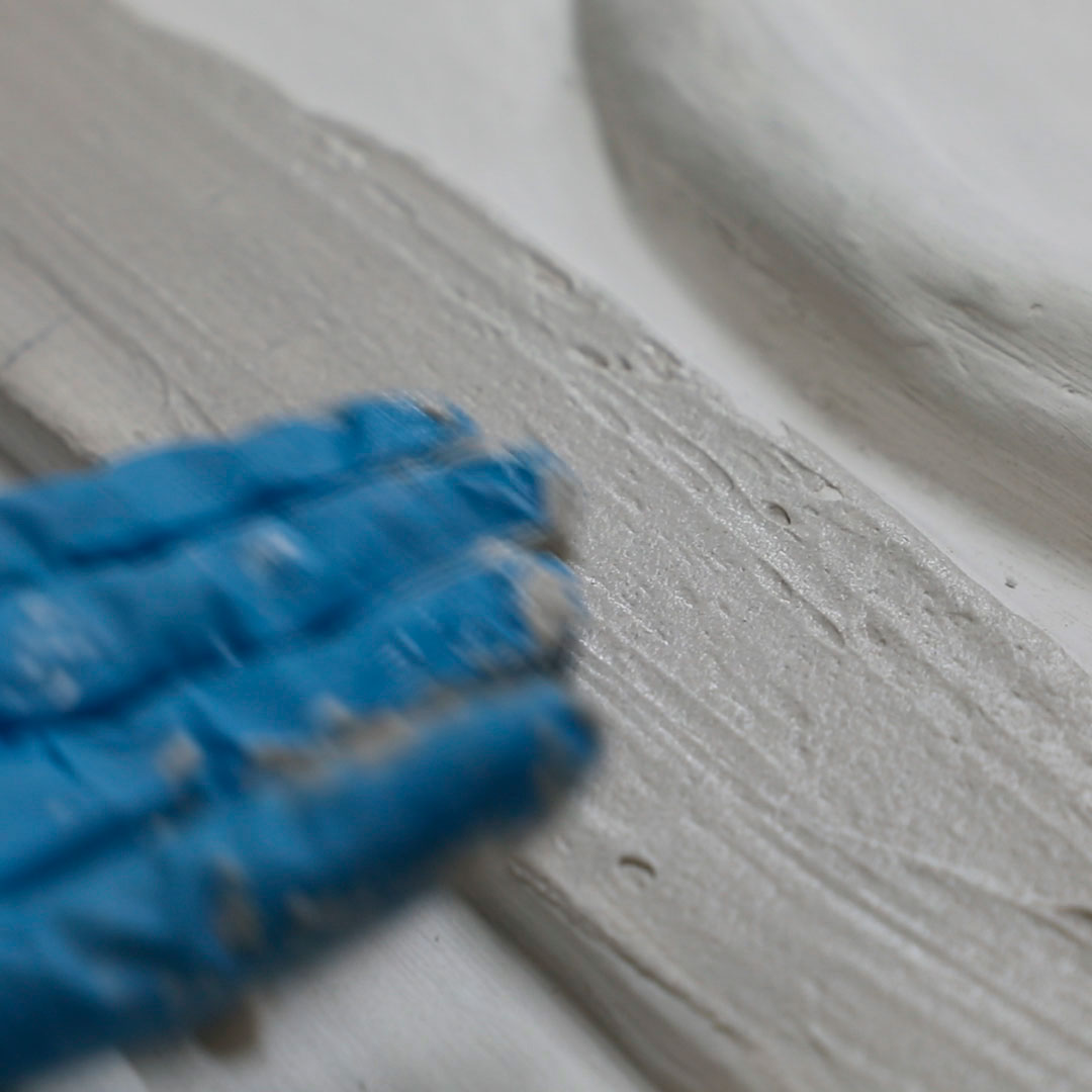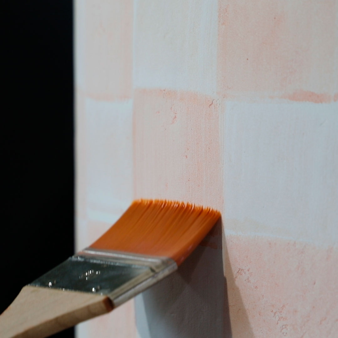 Patricia Bustos Studio diseñó dos muebles para el espacio “Tacto sereno” inspirados en el brutalismo arquitectónico: un mostrador de 3,13 x 2,80 m. y un banco de 2,10 x 0,32 m.Los artistas del Atelier se encargaron de reproducir ambas piezas para recubrirlas posteriormente con cerámica. Finalmente aplicaron una pátina para dar unaspecto envejecido, las pintaron en degradado con tonos poco saturados y las terminaron con una fina pátina dorada.