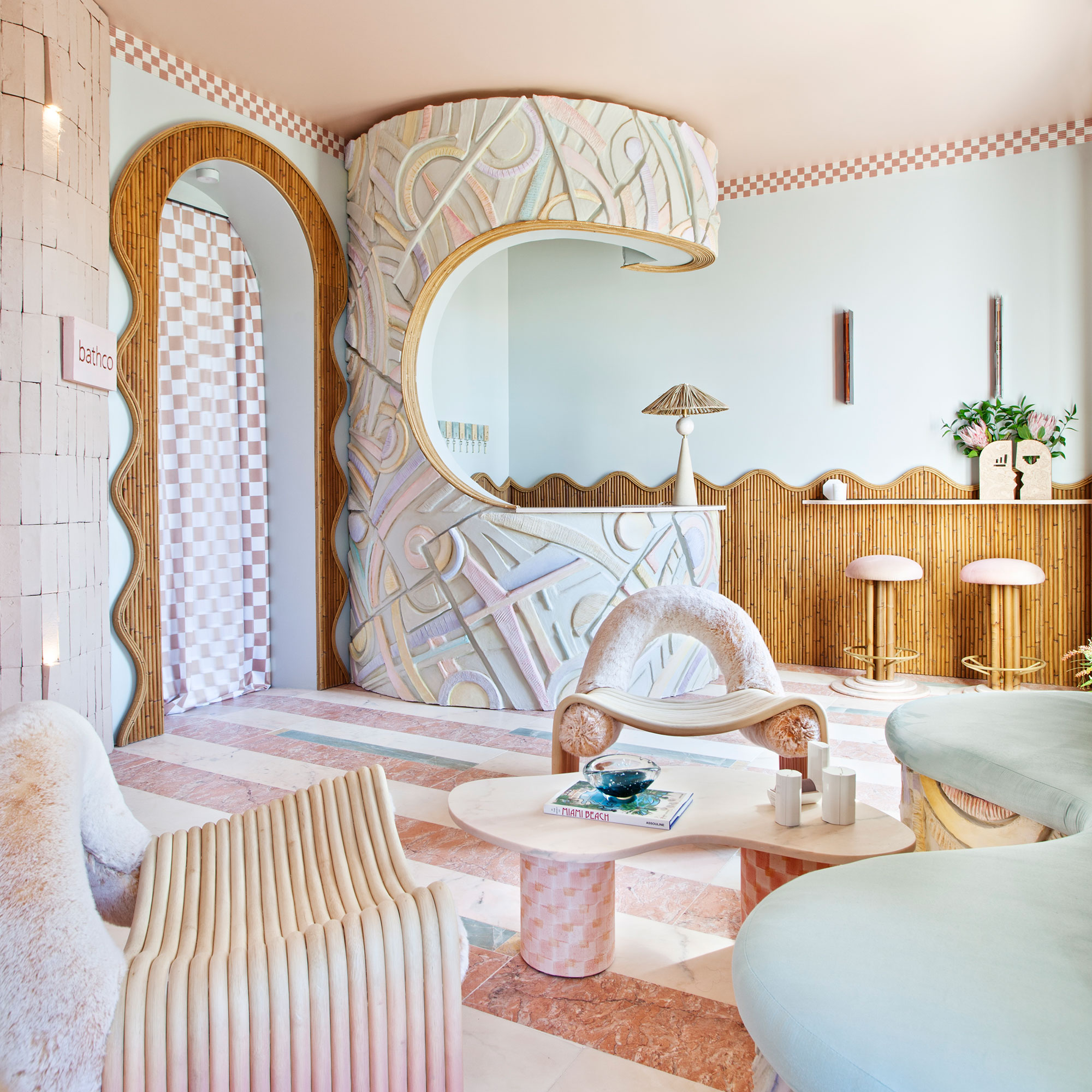 El lavabo se convierte en una pieza clave en TACTO SERENO porque aparece por primera vez en un espacio público de estas características. Así el visitante puede purificarse al llegar al hall y pasar al mostrador para gestionar su reserva. En esta ocasión, se escoge el modelo Dinan circular que aparece vestido por cuadrosvichy. Tal y como avanzó Patricia Bustos hace meses, estos cuadros son tendencia en 2022 y ha querido dejarlo de manifiesto en su propuesta. Los lavabos pintados por los artistas de Bathco Atelier se colocan sobre peanas y se completan con la grifería Tasos. Sobre una forma cilíndrica los artistasaplican una capa cerámica que pintan simulando los mismos cuadros que se ven en los lavamanos y así se crean las peanas. Siguiendo la misma técnica, se hizo una reproducción a escala de los pedestales para crear unas patas de la mesa que se puede ver en el centro del espacio.
