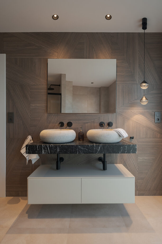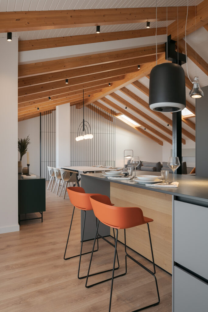 El diseño del dúplex se organiza de manera funcional, con las áreas privadas ubicadas en la planta baja, que incluyen dormitorios, baño con lavabo Fiji de Bathco, un despacho y una práctica lavandería. Por otro lado, la planta alta se convierte en el corazón social del hogar. Un espacio diáfano que integra la cocina, el comedor, el salón y una encantadora terraza, todo bañado en luz natural y con una estructura de techos a dos aguas que le confiere un aire moderno y espacioso.