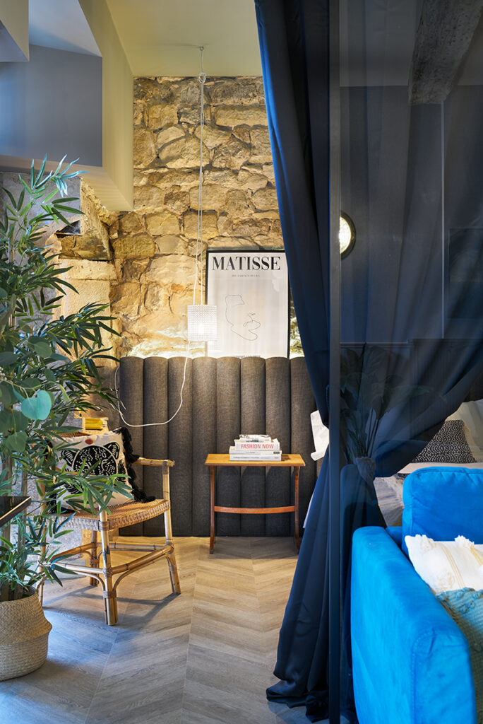 Tras una celosía metálica y de cristal se encuentra el dormitorio. Luana García, interiorista responsable del proyecto, destaca que “respetamos las paredes originales de piedra y trabajamos muchísimo la luz y las texturas en los nuevos acabados”.
