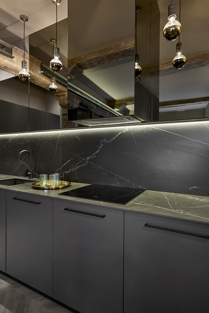 Junto al sofá enfrentado a la chimenea y la mesa del comedor encontramos “una cocina que no parece una cocina… integrada completamente en el espacio y multiplicando la luz de este pequeño apartamento”. La parte superior se cubre de espejos para que los reflejos de las lámparas generen más claridad.