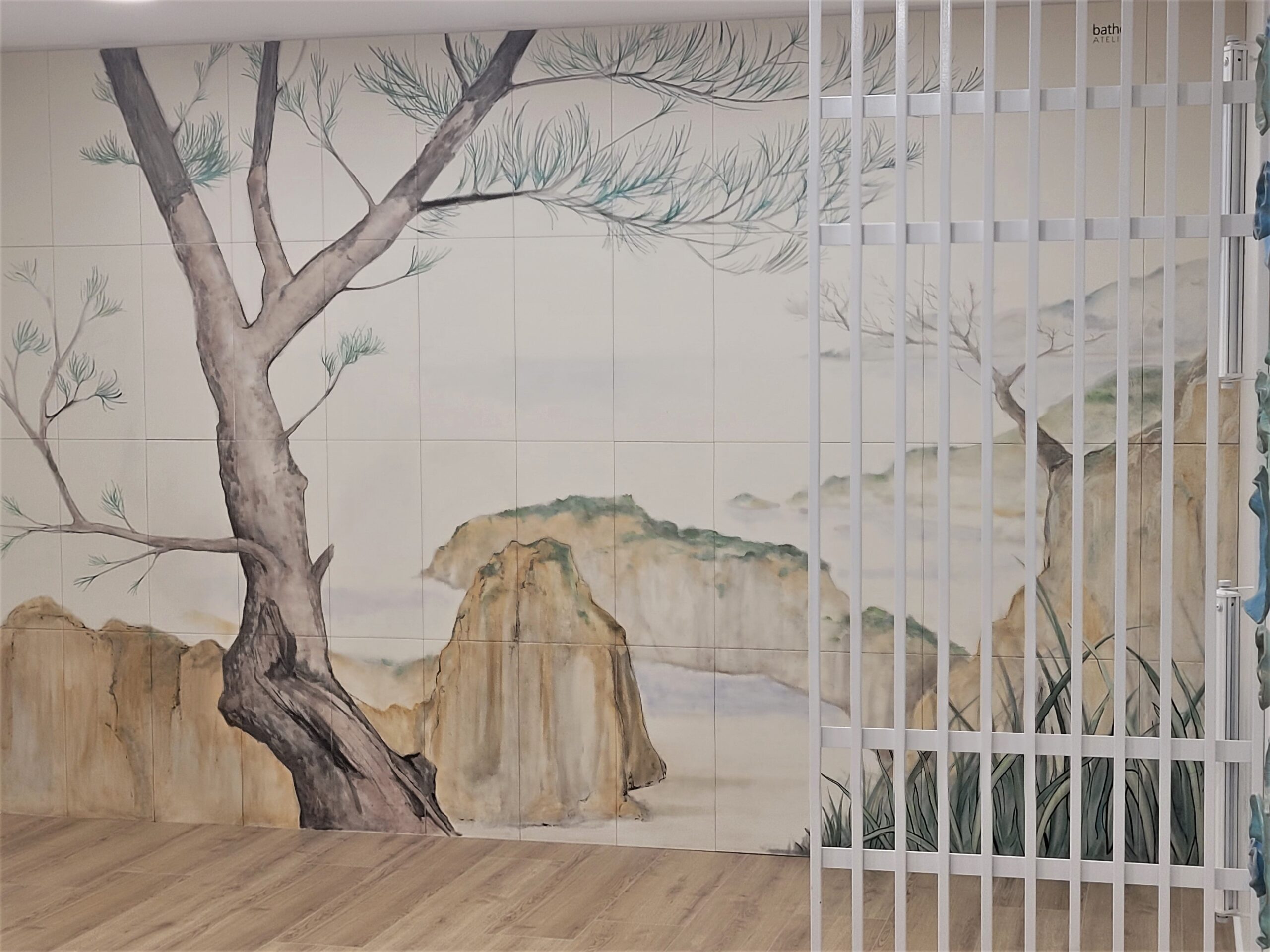 Del taller de la empresa cántabra surgen murales de gran formato para instalar en cualquier espacio. Para esta ocasión, los artistas volcaron toda su creatividad con pinceladas de pigmentos cerámicos y lumínicos sobre azulejos de 30×60 cm. Con esos azulejos formaron un gran mural pieza a pieza como si de un puzle se tratase.