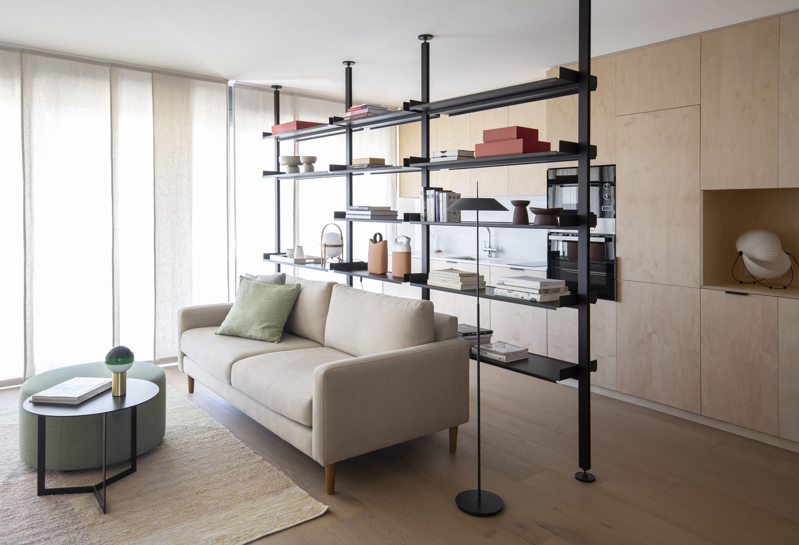 La prioridad era aprovechar al máximo la luz natural que entra por el balcón y redistribuirla hacia los rincones más oscuros del apartamento. La solución fue abrir el espacio creando una gran zona de día que une salón, comedor y cocina en un ambiente continuo. La cocina, realizada en madera de haya, aporta calidez y neutralidad, mientras que la librería abierta en negro sirve como separador y da funcionalidad tanto al salón como a la cocina. Esta pieza central también incluye una barra de desayunos, un toque práctico pensado para aprovechar al máximo cada rincón.
