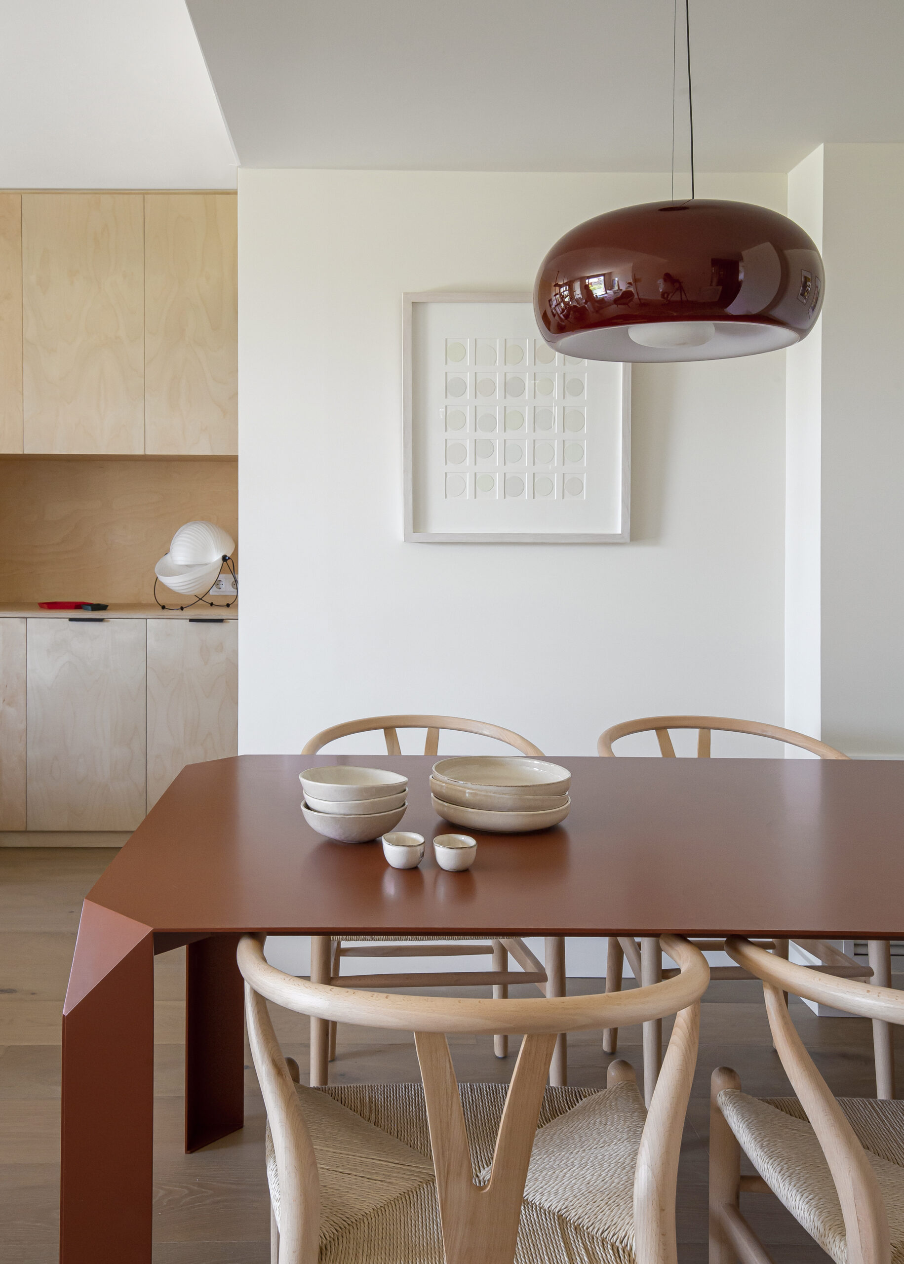 El toque final de esta reforma viene dado por la cuidadosa selección de colores. Mientras que la paleta principal se mantiene en tonos neutros, como el beige de la madera de haya y el negro de la librería, elementos decorativos en tonos teja como la mesa y la lámpara del comedor, o los detalles del baño de cortesía, añaden personalidad sin saturar el espacio. Esta fusión de calidez y modernidad define el espíritu de la reforma y muestra la habilidad de la interiorista para equilibrar funcionalidad y estilo.