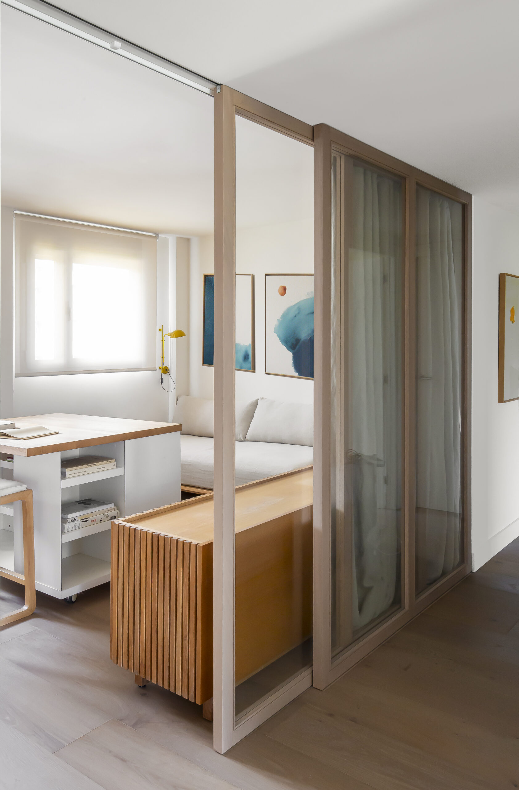 Una de las características más destacadas de la reforma es el estudio polivalente. Este espacio puede funcionar tanto como zona de trabajo como dormitorio de invitados, gracias a una cama de estilo minimalista y una gran puerta corredera de cristal que conecta visualmente con la zona de día. Cuando se requiere mayor privacidad, una cortina decorativa permite aislar el espacio.