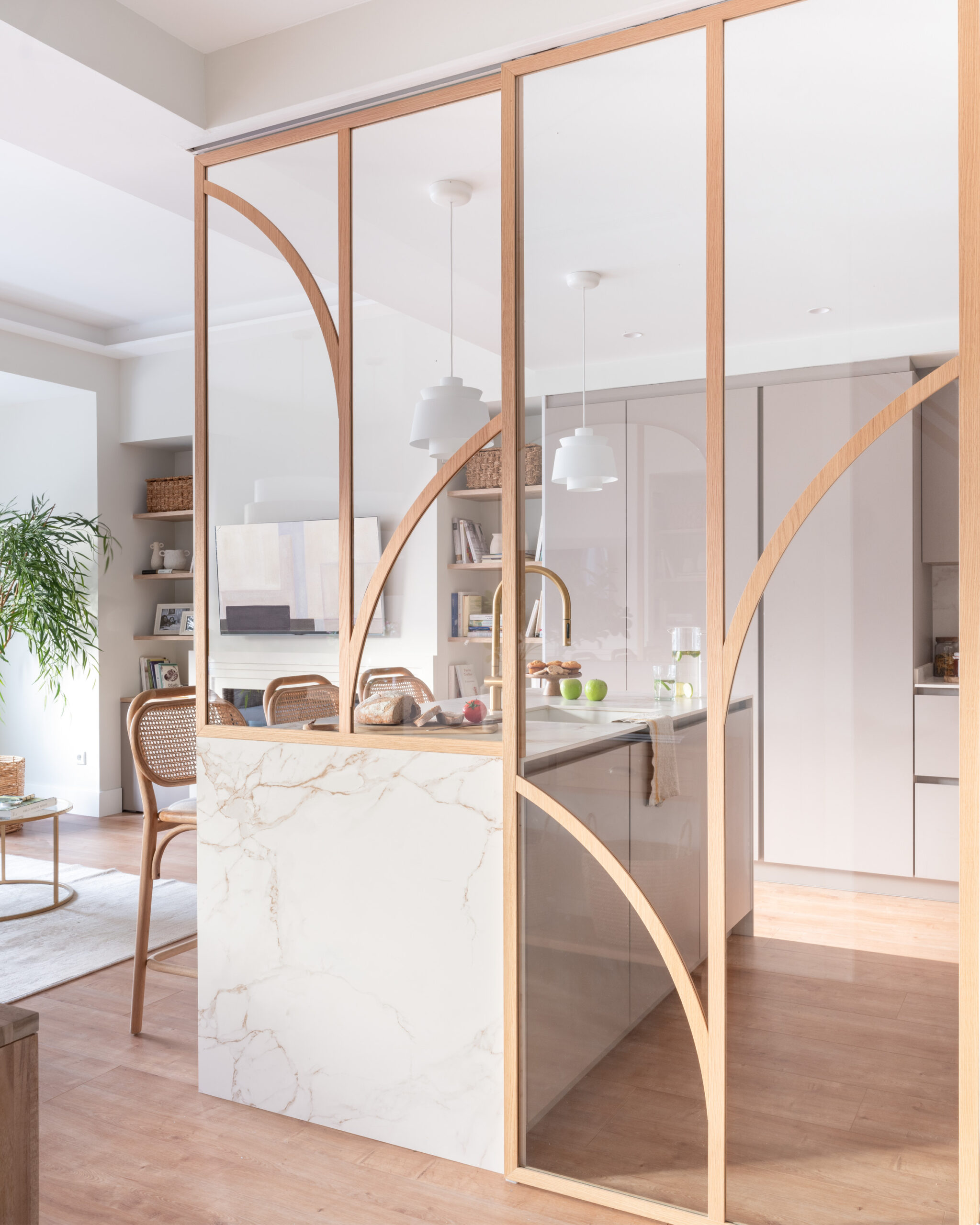 El salón, comedor y cocina comparten un espacio diáfano, diseñado para fomentar la interacción y la convivencia familiar. Con una paleta de tonos neutros, combinada con toques de verde grisáceo y mostaza, estos ambientes irradian calidez y elegancia. La integración de una cristalera corredera entre la cocina y el recibidor no solo añade un toque decorativo, sino que también permite una transición fluida entre las diferentes zonas de la casa.