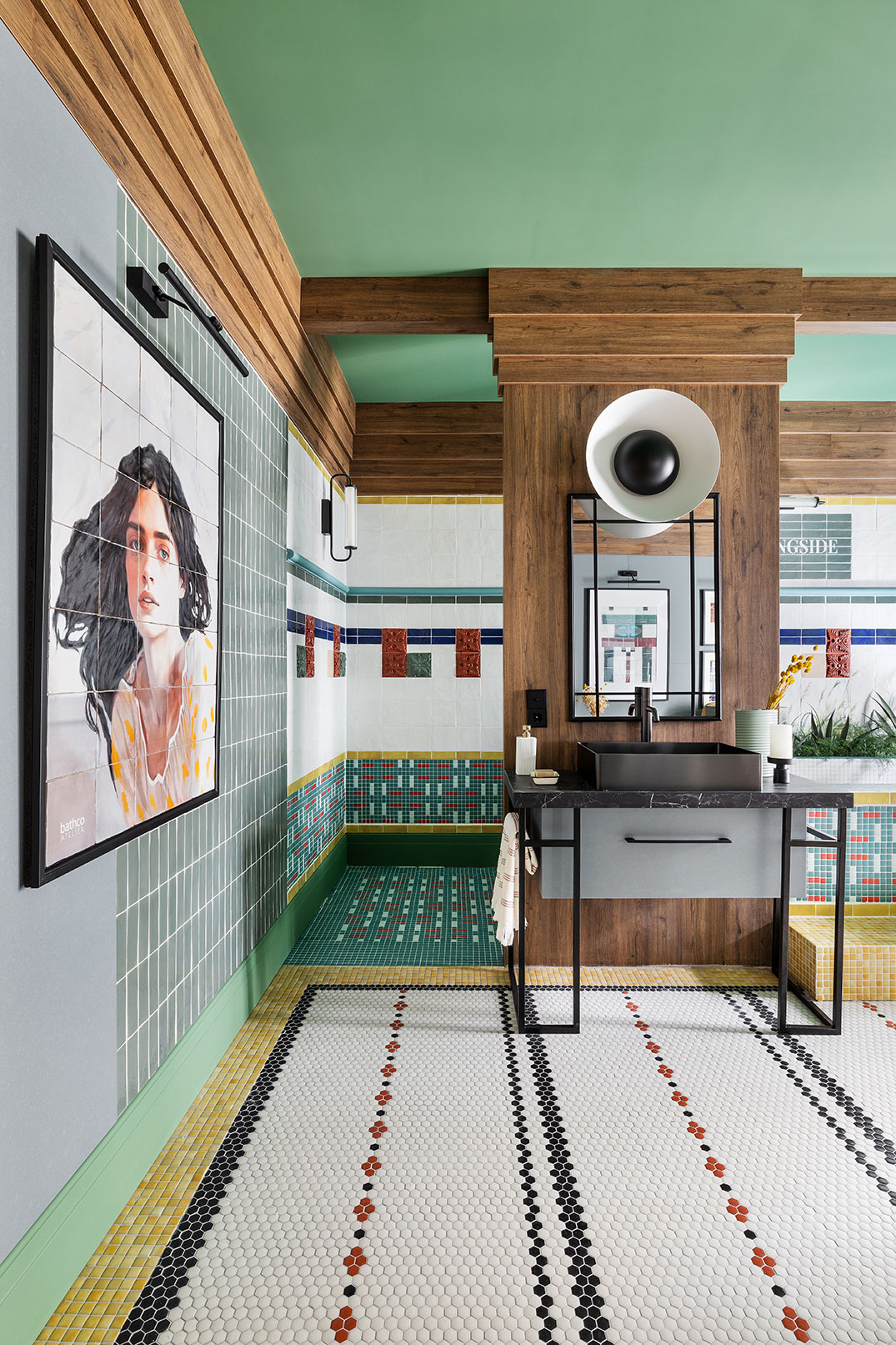Este alegato a favor del cuarto de baño y de las Tenement Tiles está presente en cada uno de los elementos constructivos de este espacio donde se destaca el uso de la cerámica por ser económica e infinitamente versátil que ha permitido crear un espacio divertido, diferente y lleno de color.El despiece de todos azulejos es lo que más destaca del espacio y son las diferentes piezas cerámicas trabajadas minuciosamente por las manos de los artistas del Atelier de Bathco las grandes protagonistas.Por un lado, se ha realizado un trabajo de carácter pictórico plasmado en dos murales cerámicos pintados a mano y por otro lado, un trabajo más escultórico con la creación de azulejos cerámicos de bajo relieve realizados de forma totalmente artesanal.Bajo-relieves