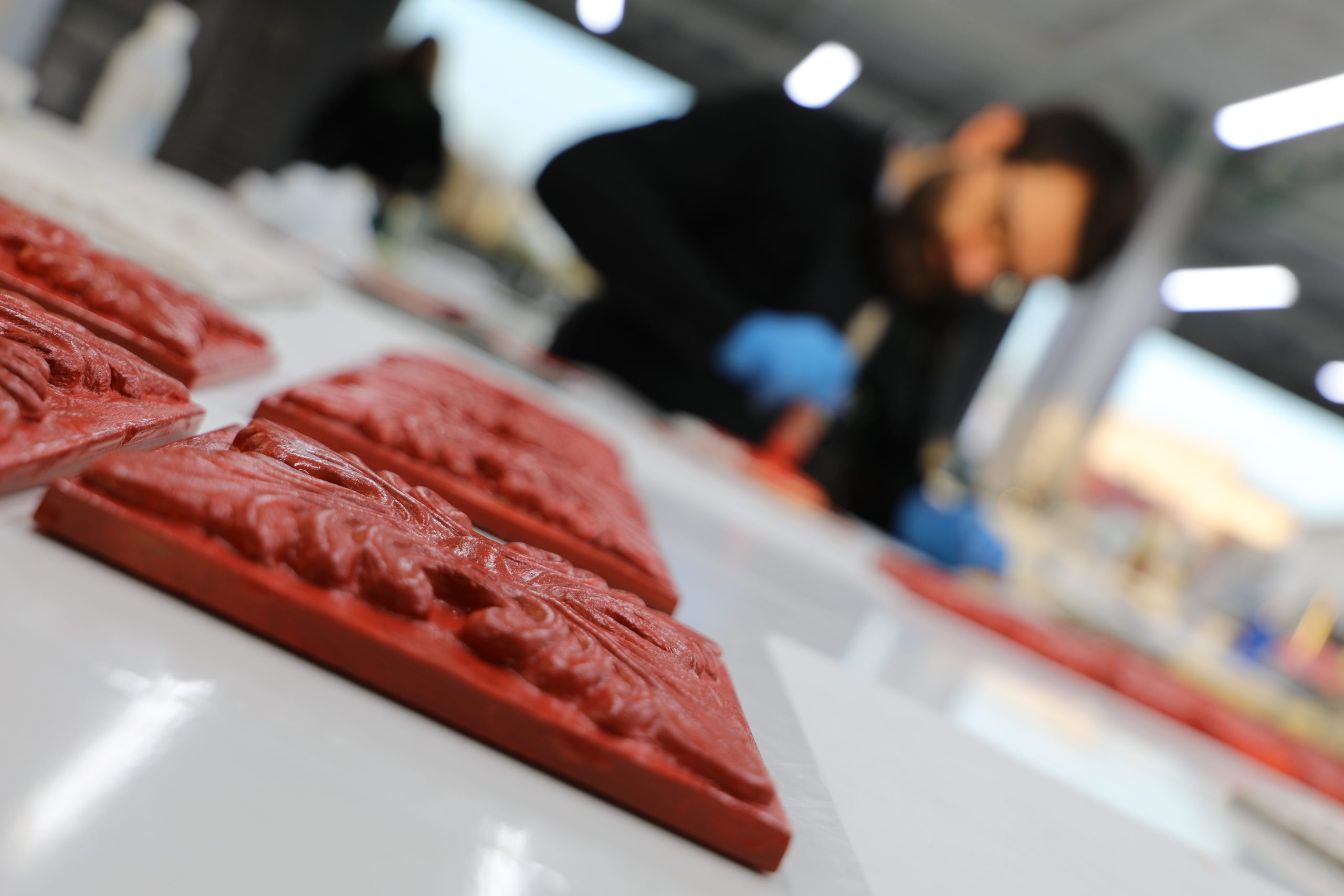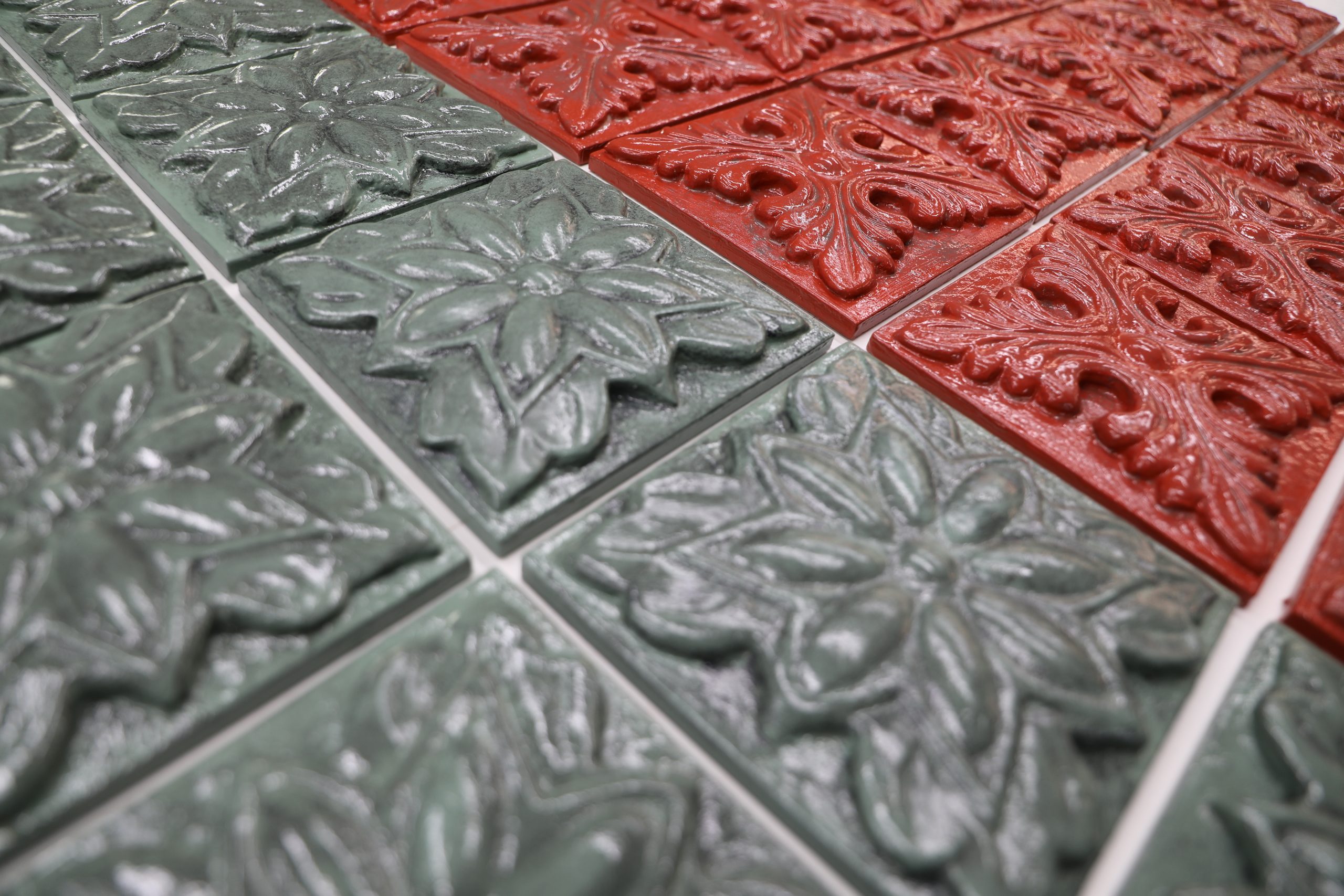 Los artistas del Atelier se han encargado de recrear esas características baldosas polícromas y profusamente decoradas de la época, inspiradas el auge del movimiento Art Nouveau y en pleno “boom” de la arquitectura Victoriana residencial.Su elaboración ha sido muy especial porque se ha realizado al revés de cómo se suele imaginar. Se ha trabajado primero con técnicas digitales, diseñadas por ordenador e impresas con máquinas 3D, para luego implementar la artesanía, sacando un negativo en escayola, introduciendo pasta cerámica a presión. Para posteriormente, hornear y esmaltar a mano cada azulejo individualmente.